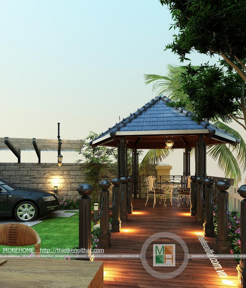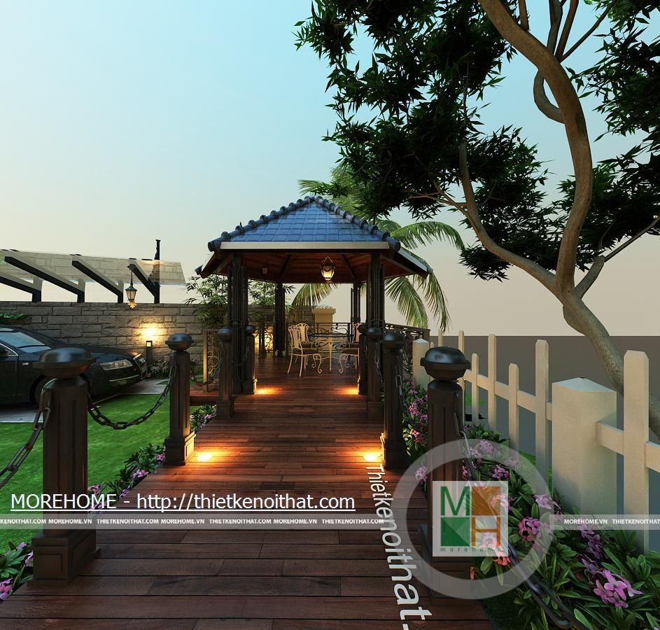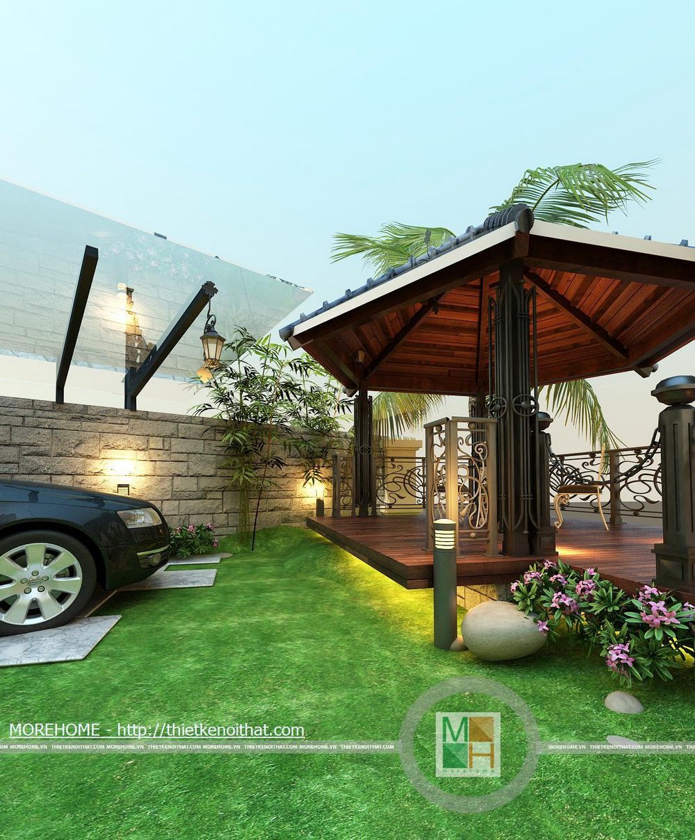 Khu giải trí thư giãn có diện tích rộng, thoáng đãng hướng ra hồ nhân tạo, tạo không gian hòa quyện với thiên nhiên. Sân vườn được liên kết với căn nhà bằng một hành lang rộng rãi. Toàn sảnh vườn được thiết kế hoàn toàn từ gỗ tự nhiên tôn thêm nét sang trọng cho căn biệt thự. Trên hành lang lớn có 1 bộ bàn ăn phục vụ cho như cầu ăn uống ngoài trời. Ngoài ra còn có một sảnh lớn có mái che, trên sảnh được đặt một bộ bàn ghế nhỏ để gai chủ có thể nghỉ ngơi thư giãn đọc sách báo hoặc uống cà phê vào buổi sáng. Thêm một điểm cộng cho lối kiến trúc độc đáo này chính là hệ thống đèn chiếu sáng được đặt trên các cột gỗ dọc hành lang. Lán che ô tô cũng được thiết kế rộng rãi phù hợp với diện tích không gian khu vườn. Nổi bật trên nền cỏ xanh là những lối đi nhỏ được lát đá tự nhiên. Phía bên hông nhà cũng được tận dụng để đặt một hòn non bộ nhỏ, kiểu bố trí đơn giản nhưng vẫn đem lại được không gian thoải mái cho toàn bộ ngôi nhà
