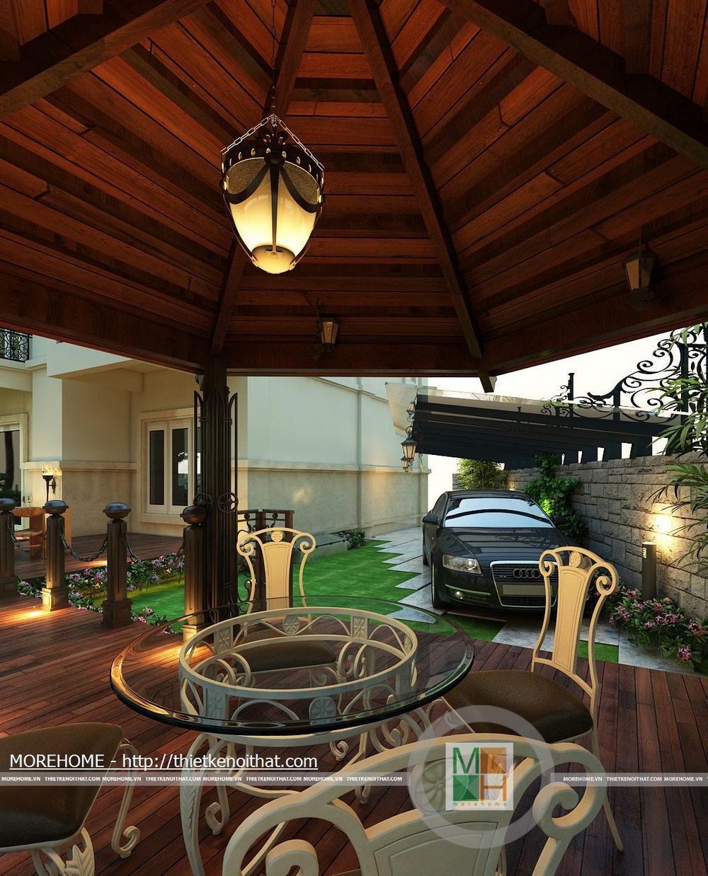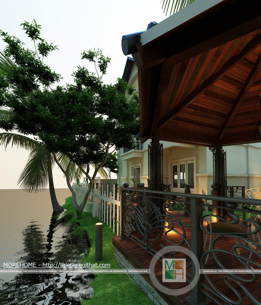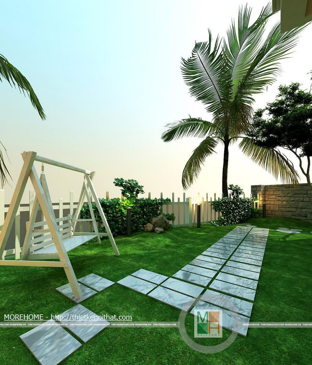Khu giải trí thư giãn có diện tích rộng, thoáng đãng hướng ra hồ nhân tạo, tạo không gian hòa quyện với thiên nhiên. Sân vườn được liên kết với căn nhà bằng một hành lang rộng rãi. Toàn sảnh vườn được thiết kế hoàn toàn từ gỗ tự nhiên tôn thêm nét sang trọng cho căn biệt thự. Trên hành lang lớn có 1 bộ bàn ăn phục vụ cho như cầu ăn uống ngoài trời. Ngoài ra còn có một sảnh lớn có mái che, trên sảnh được đặt một bộ bàn ghế nhỏ để gai chủ có thể nghỉ ngơi thư giãn đọc sách báo hoặc uống cà phê vào buổi sáng. Thêm một điểm cộng cho lối kiến trúc độc đáo này chính là hệ thống đèn chiếu sáng được đặt trên các cột gỗ dọc hành lang. Lán che ô tô cũng được thiết kế rộng rãi phù hợp với diện tích không gian khu vườn. Nổi bật trên nền cỏ xanh là những lối đi nhỏ được lát đá tự nhiên. Phía bên hông nhà cũng được tận dụng để đặt một hòn non bộ nhỏ, kiểu bố trí đơn giản nhưng vẫn đem lại được không gian thoải mái cho toàn bộ ngôi nhà