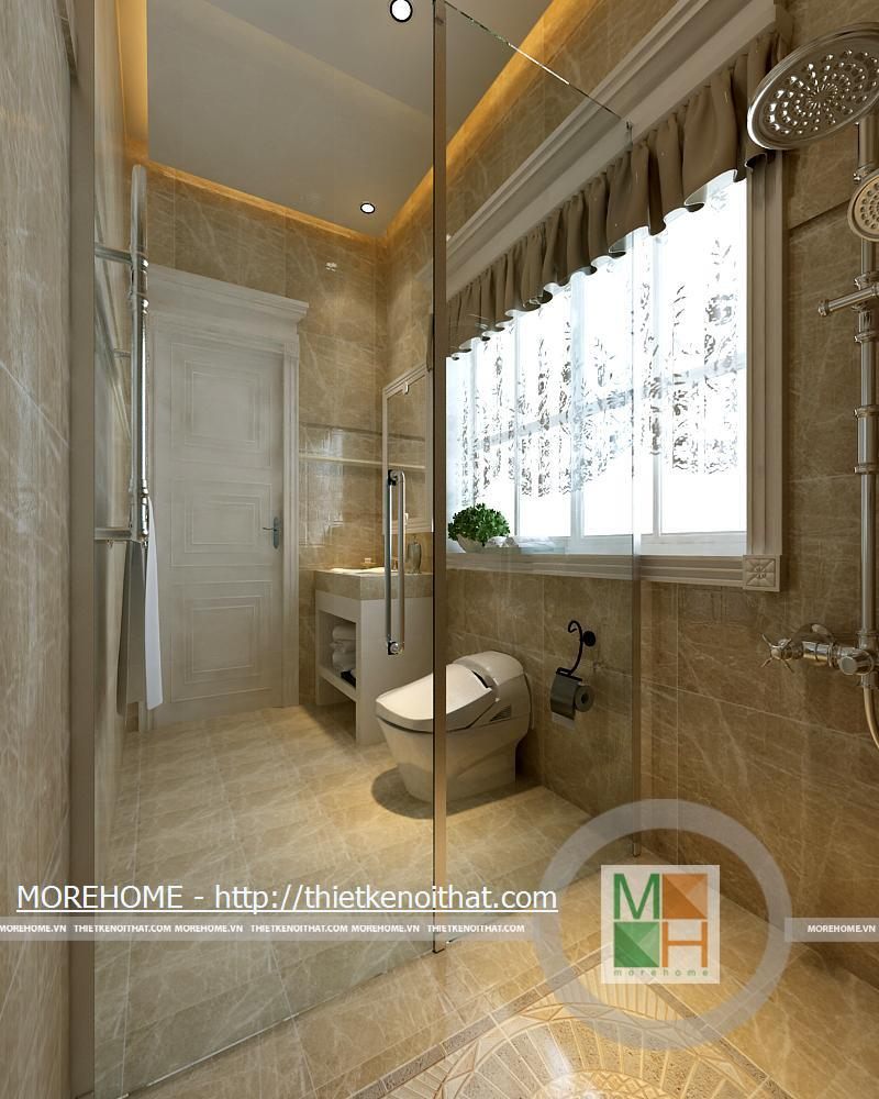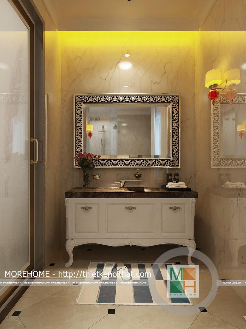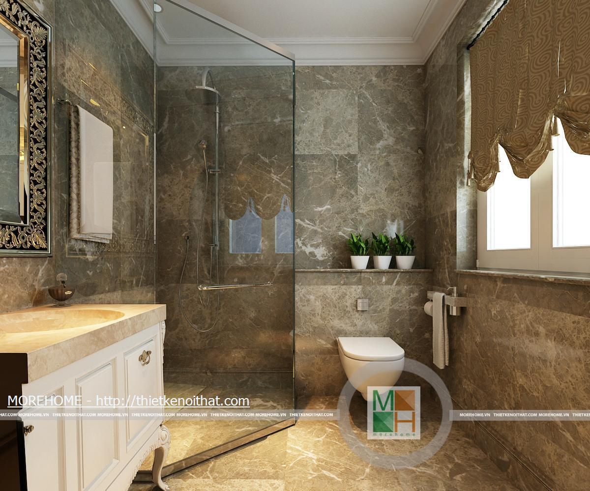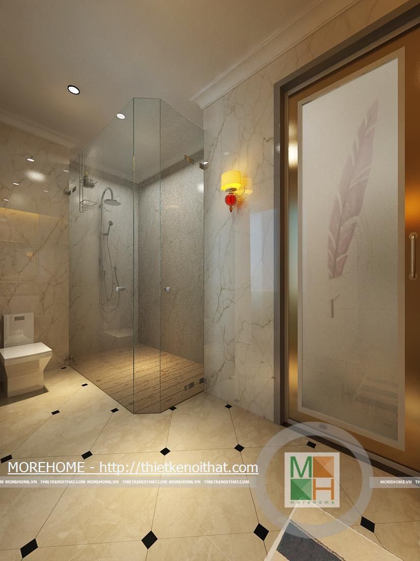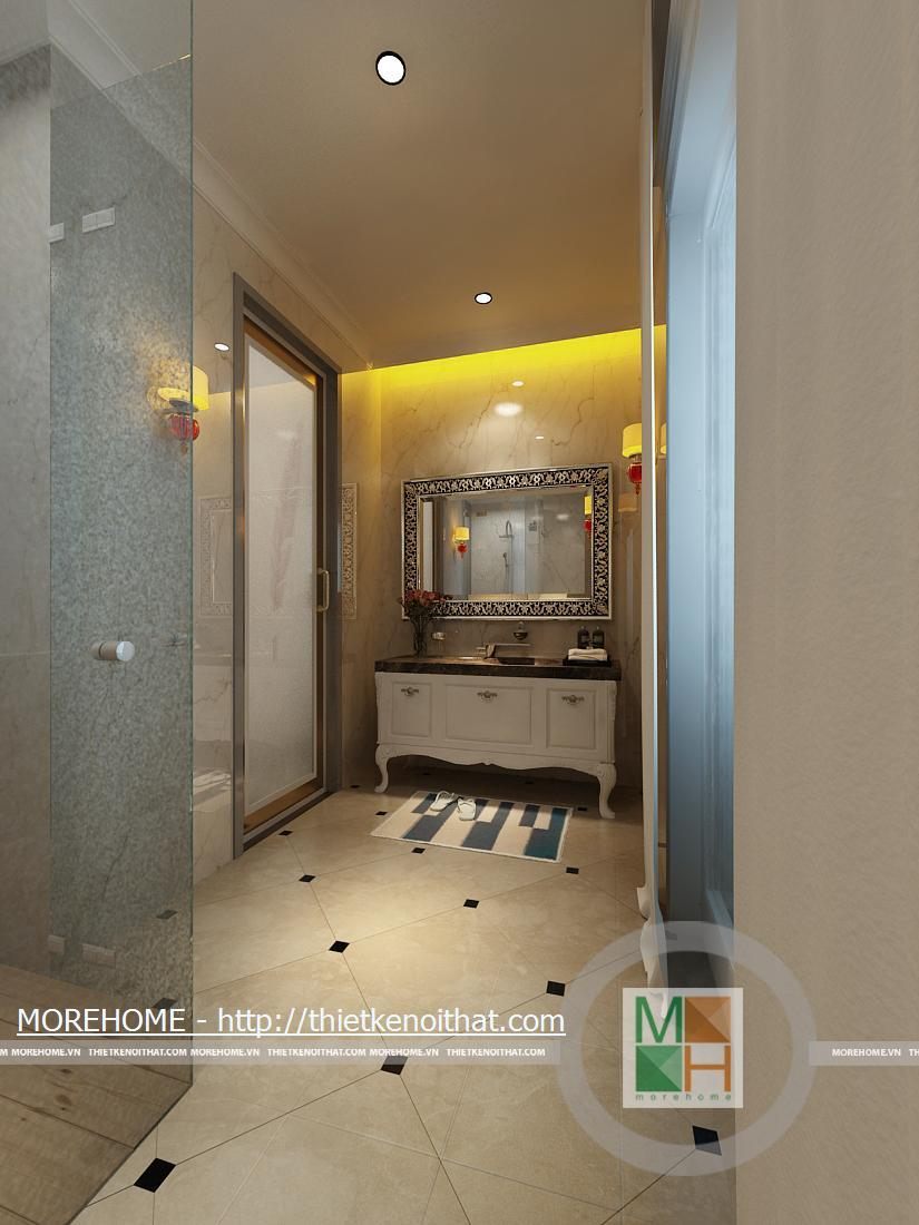 Phòng tắm lớn được trang bị bồn tắm cao cấp có diện tích rất rộng. Toàn bộ tường và nền được ốp đá tự nhiên màu sắc trang nhã. Trong phòng được kê một kệ dùng để vật dụng và đồ trang trí. Hệ thống ánh sáng trong phòng chủ yếu từ đèn âm trần và của sổ lớn hướng ánh sáng tự nhiên.