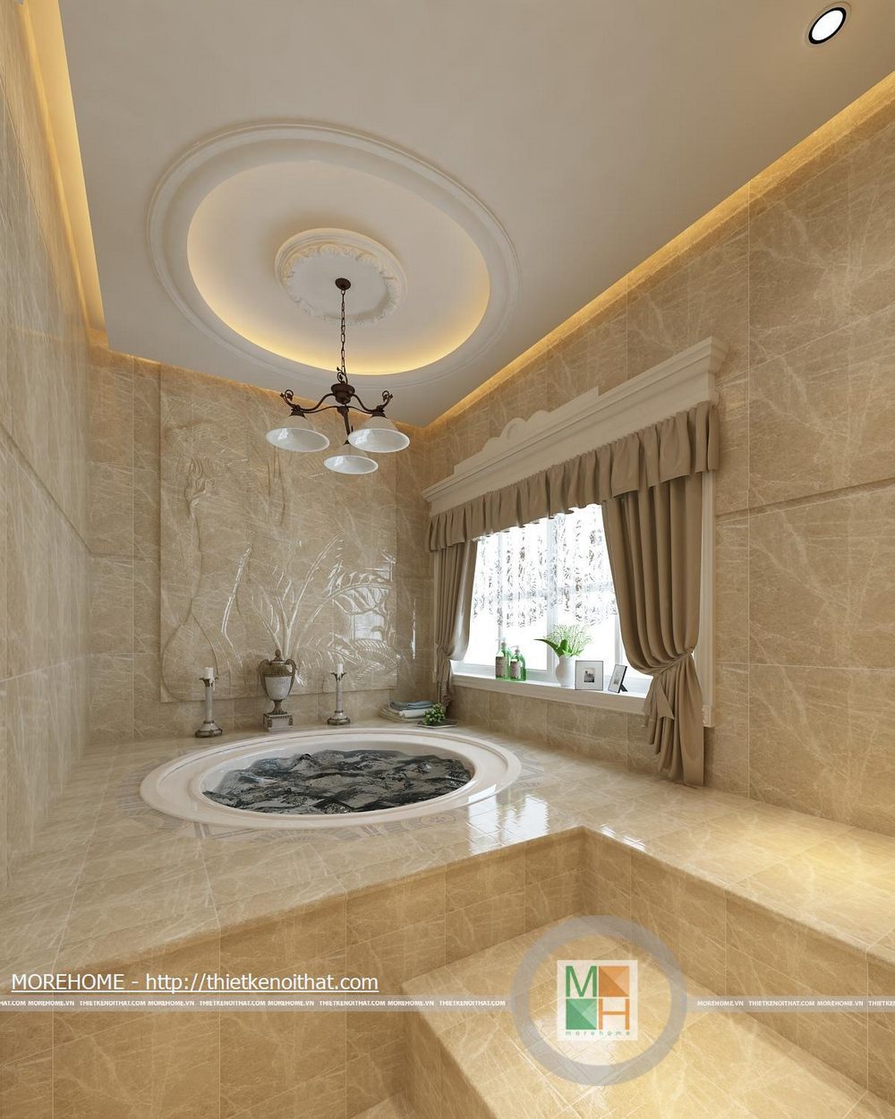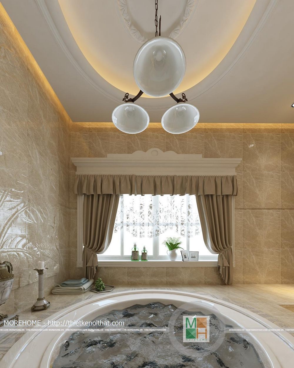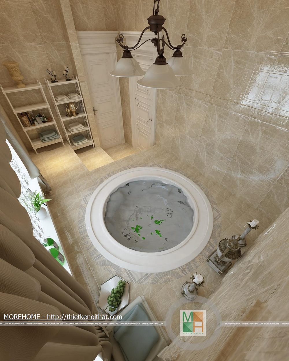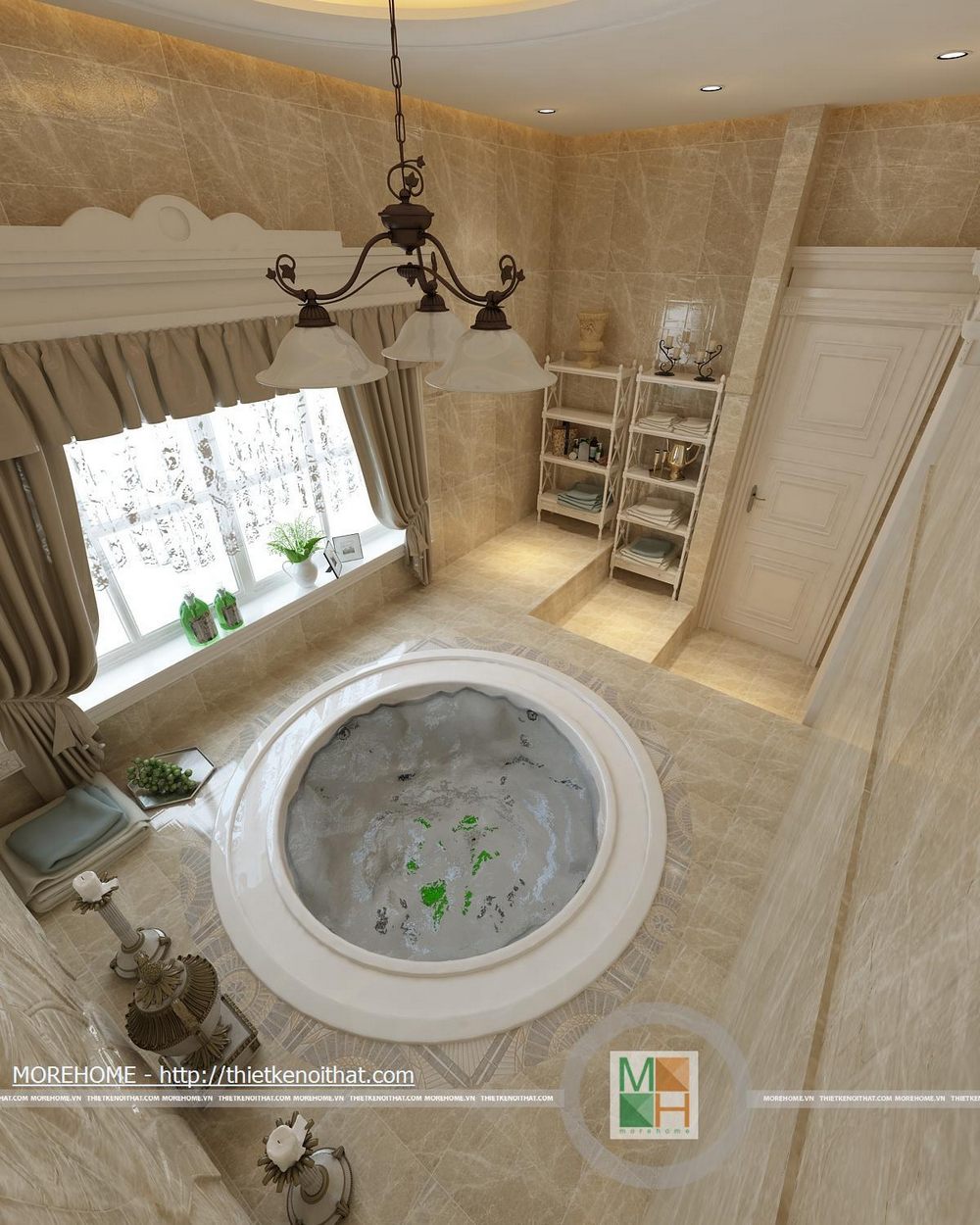 Phòng tắm lớn được trang bị bồn tắm cao cấp có diện tích rất rộng. Toàn bộ tường và nền được ốp đá tự nhiên màu sắc trang nhã. Trong phòng được kê một kệ dùng để vật dụng và đồ trang trí. Hệ thống ánh sáng trong phòng chủ yếu từ đèn âm trần và của sổ lớn hướng ánh sáng tự nhiên.