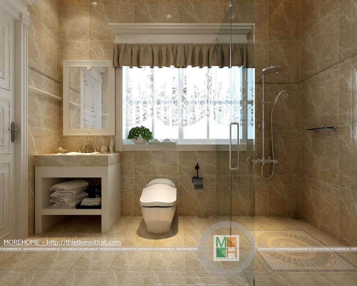 Phòng WC chung thông thoáng với một của sổ lớn đem lại sự thoải mái. Wc chung thiết kế đơn giản có buồng tắm kính lớn, kệ để khăn tắm và gương soi nằm sát cửa ra vào.