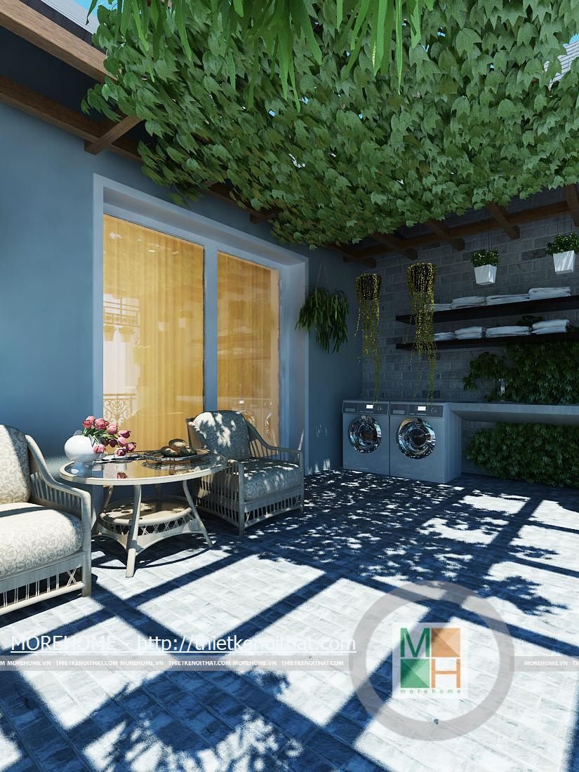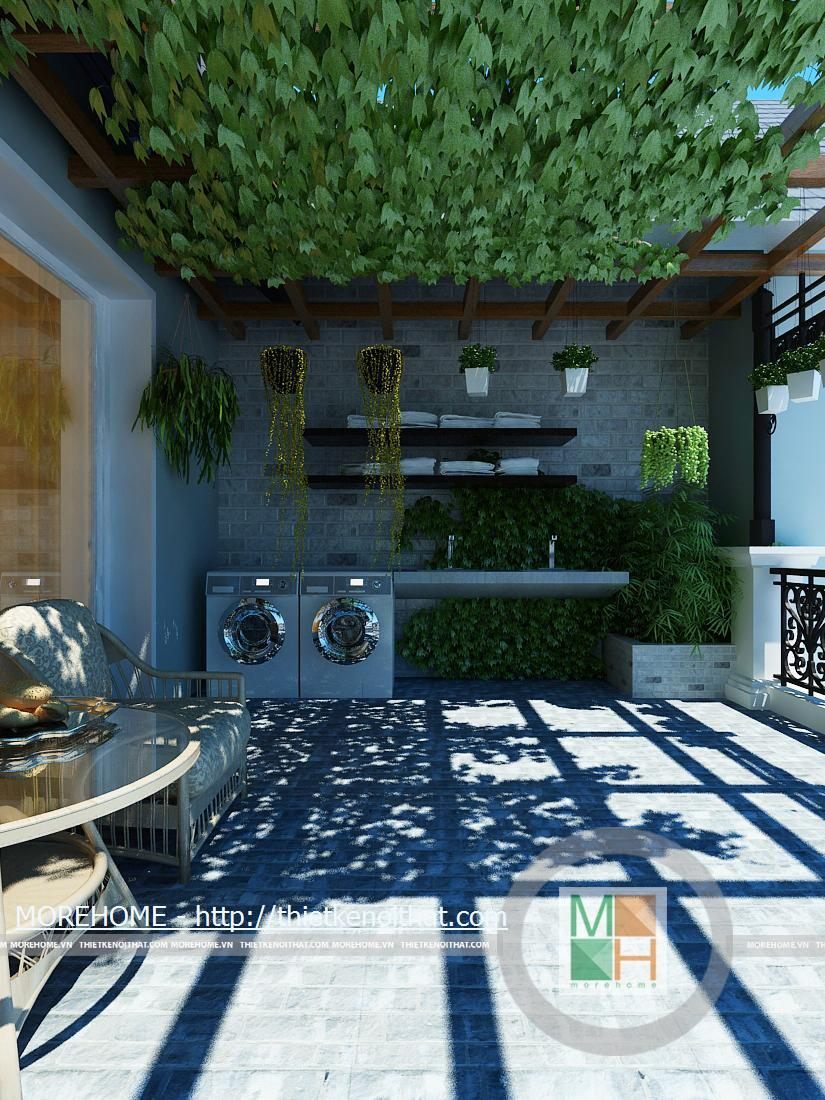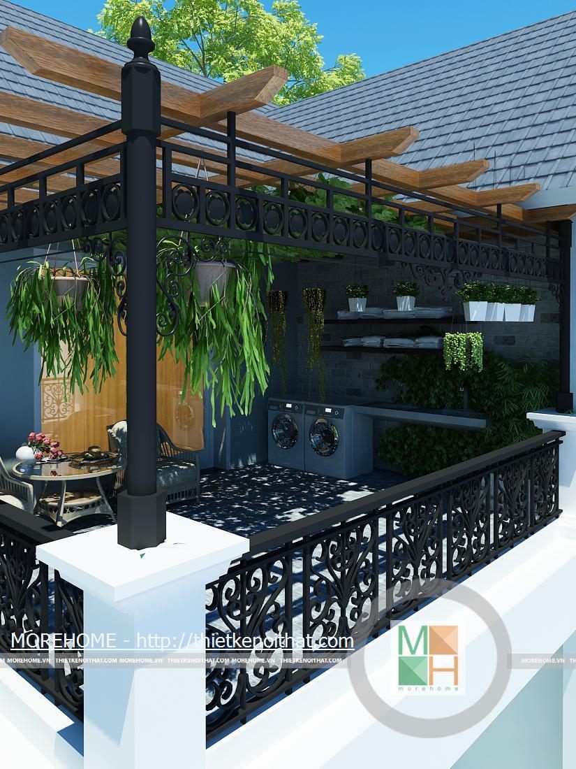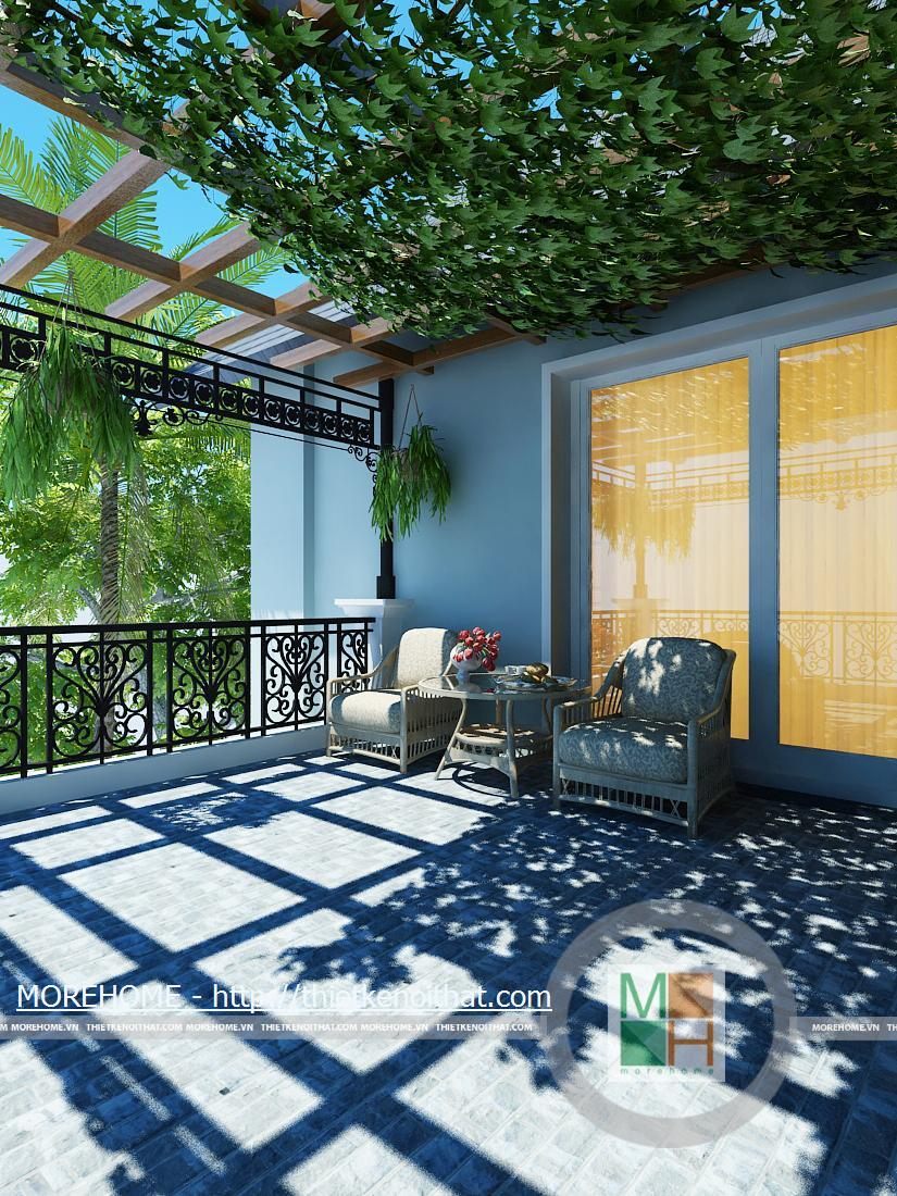 Sảnh lớn phía sau nhà trên ban công tầng hai khá rộng và mát nhờ dàn cây lẽo bên trên, đây là một không gian gần gũi với thiên nhiên trồng nhiều cây xanh tạo không khí cho căn nhà. Trên sảnh kê một bộ bàn uống nước nhỏ để gia chủ nghỉ ngơi thư giãn.