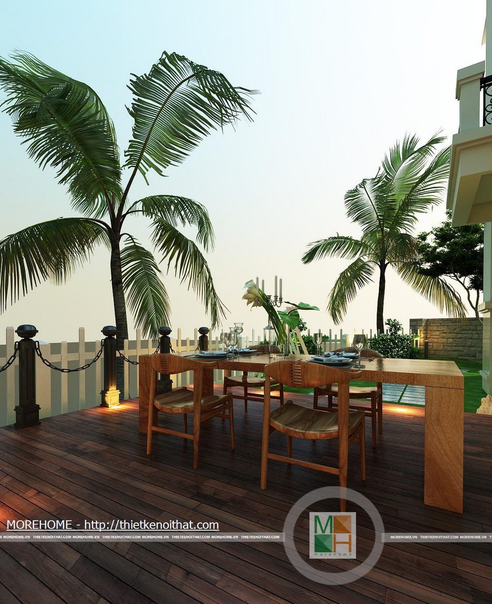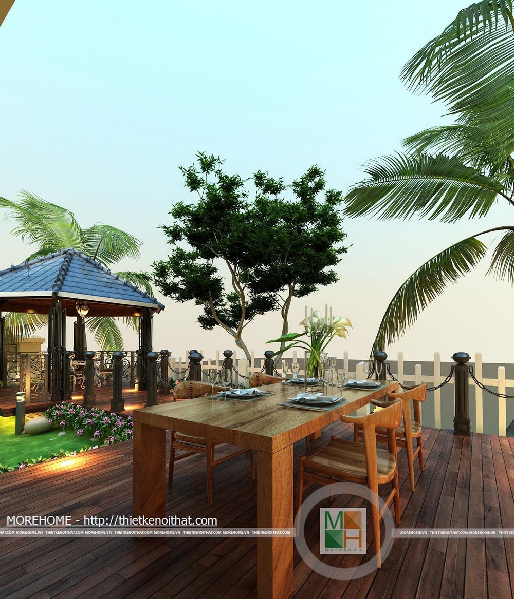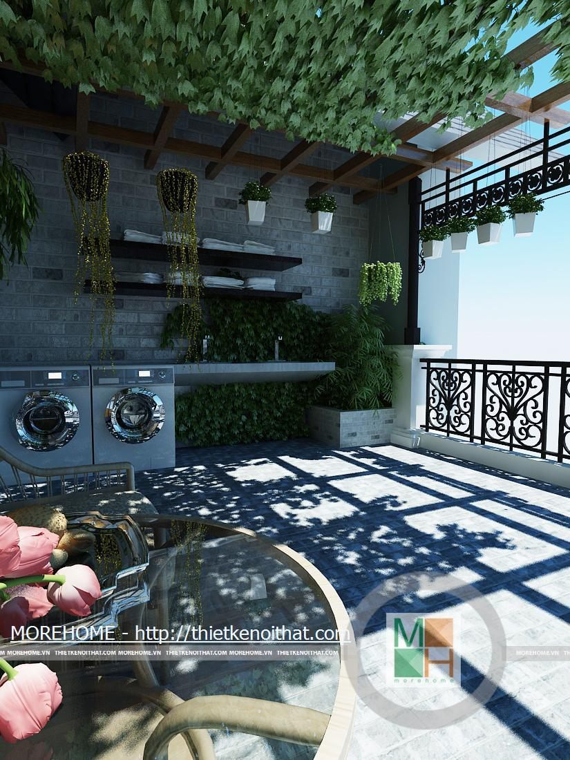Sảnh lớn phía sau nhà trên ban công tầng hai khá rộng và mát nhờ dàn cây lẽo bên trên, đây là một không gian gần gũi với thiên nhiên trồng nhiều cây xanh tạo không khí cho căn nhà. Trên sảnh kê một bộ bàn uống nước nhỏ để gia chủ nghỉ ngơi thư giãn.