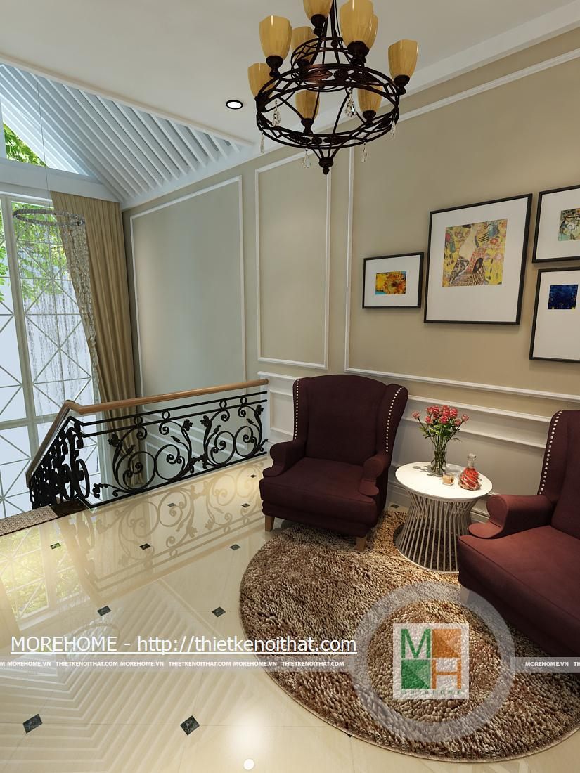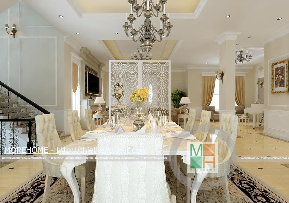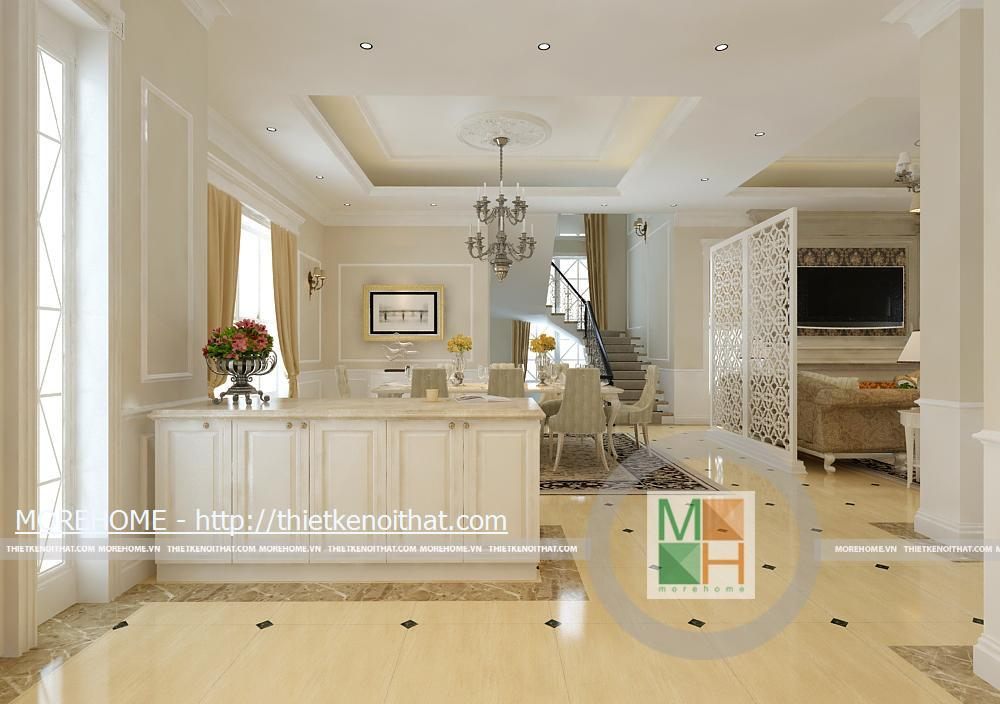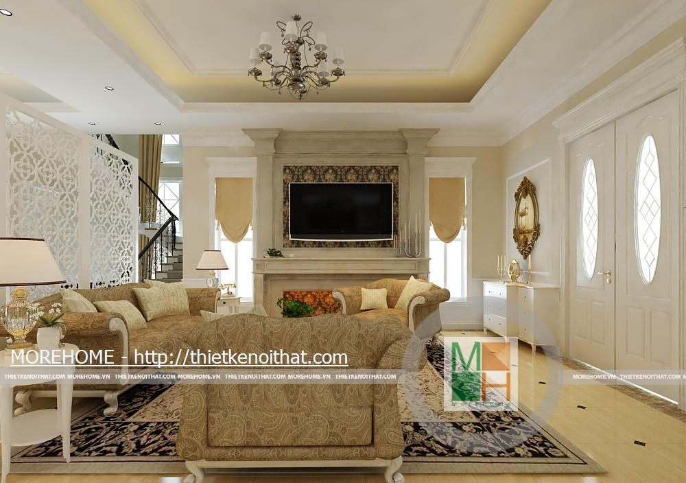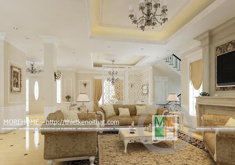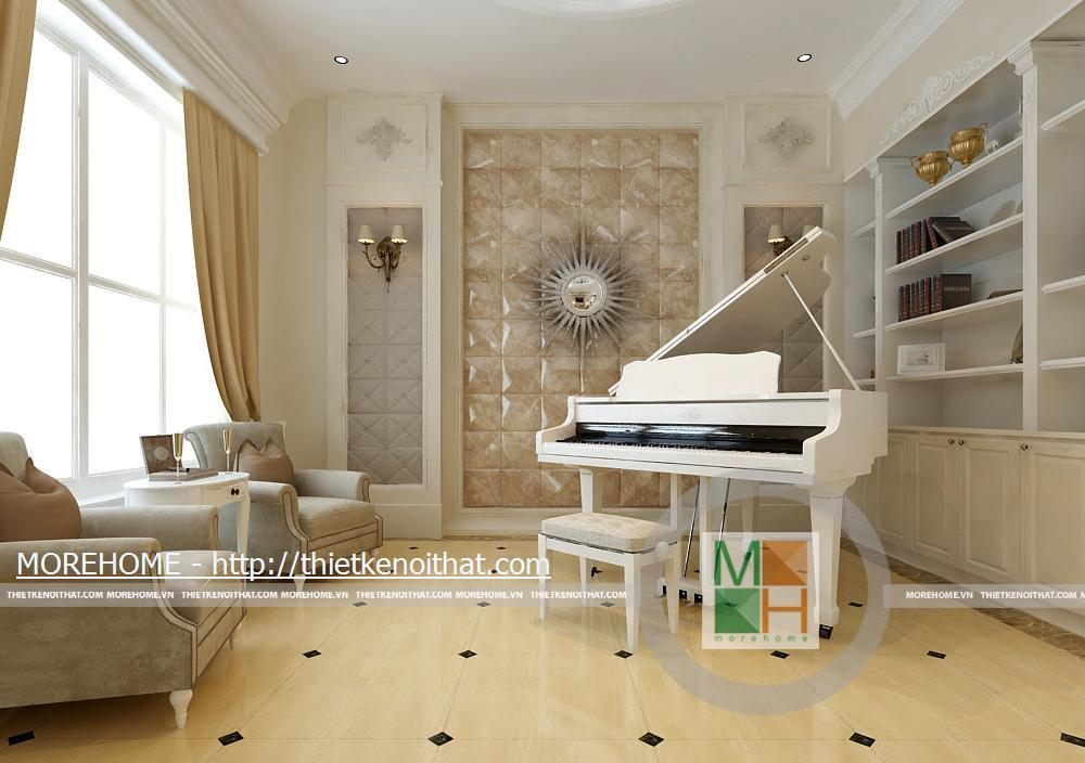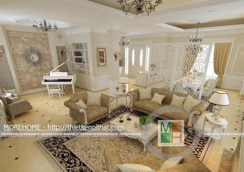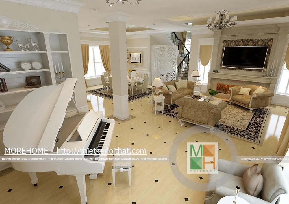 Phòng khách rộng và được tôn thêm bởi tông màu trắng sáng. Sàn nhà được lát gạch màu vàng sâm panh nhẹ, tôn thêm sự sang trọng cho căn nhà. Nội thất cũng được thiết kế cùng tông màu với gạch lát sàn, kiểu dáng pha chút cổ điển, mang hơi hướng của kiến trúc Pháp cổ. Hệ thống đèn chiếu sáng bao gồm đèn chùm, đèn hắt, đèn tường tạo không gian ánh sáng đa dạng cho căn phòng. Điểm nhấn cho không gian phòng khách chính là chiếc piano vừa để lấp đầy khoảng trống vừa để chơi nhạc và cũng thể hiện gia chủ là người yêu nghệ thuật. Ngoài ra chi tiết kệ trang trí được đặt bên piano còn làm cho phòng khách thêm phần trang nhã.