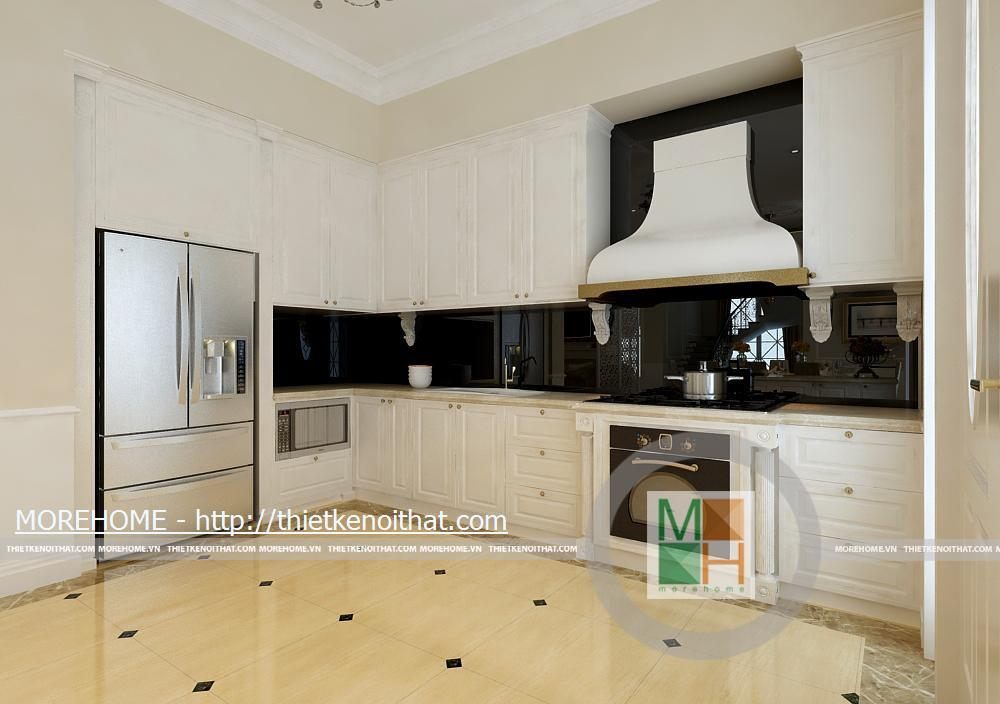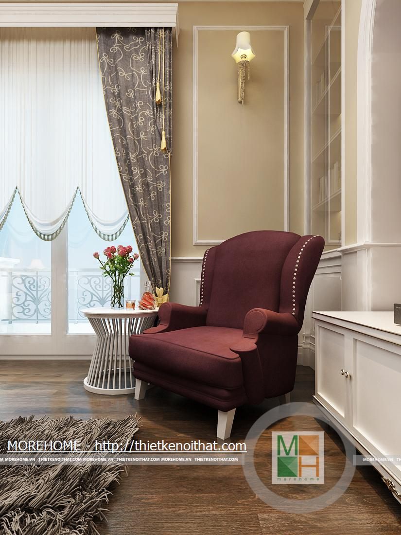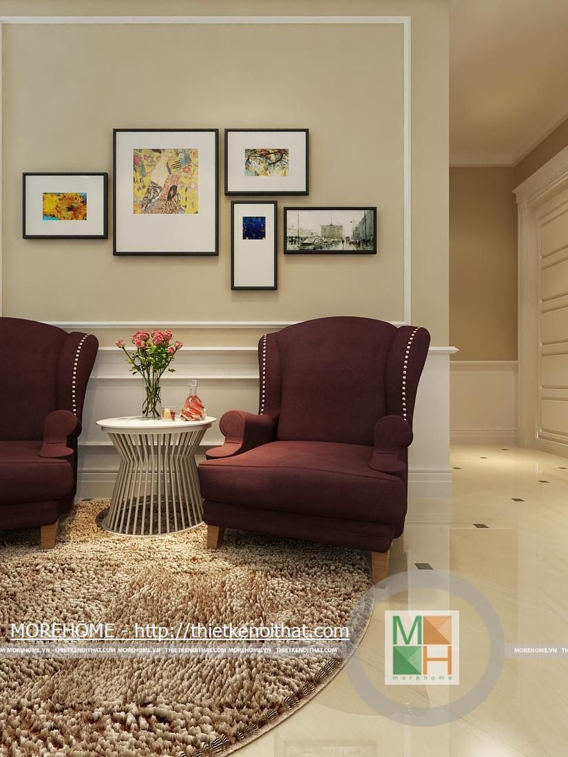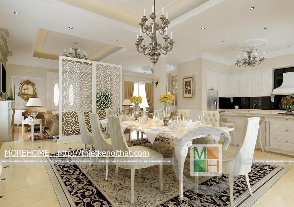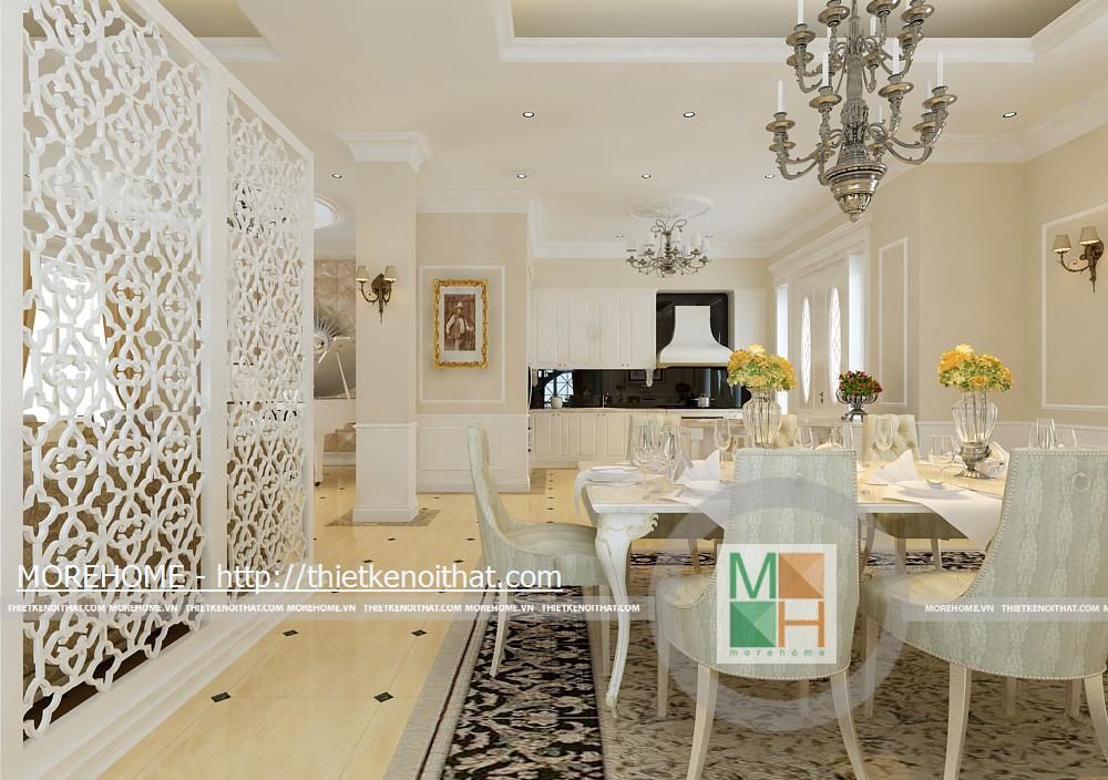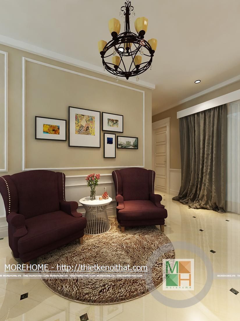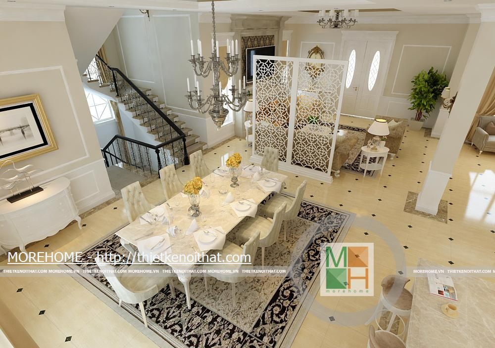Phòng khách rộng và được tôn thêm bởi tông màu trắng sáng. Sàn nhà được lát gạch màu vàng sâm panh nhẹ, tôn thêm sự sang trọng cho căn nhà. Nội thất cũng được thiết kế cùng tông màu với gạch lát sàn, kiểu dáng pha chút cổ điển, mang hơi hướng của kiến trúc Pháp cổ. Hệ thống đèn chiếu sáng bao gồm đèn chùm, đèn hắt, đèn tường tạo không gian ánh sáng đa dạng cho căn phòng. Điểm nhấn cho không gian phòng khách chính là chiếc piano vừa để lấp đầy khoảng trống vừa để chơi nhạc và cũng thể hiện gia chủ là người yêu nghệ thuật. Ngoài ra chi tiết kệ trang trí được đặt bên piano còn làm cho phòng khách thêm phần trang nhã.