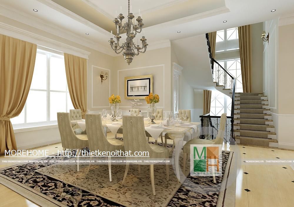 Khu vực phòng ăn với các đồ vật, nội thất được bố trí hài hòa. Bộ bàn ăn lớn được đặt chính giữa, thiết kế sang trọng cùng tông màu với màu chủ đạo của căn nhà. Điểm nổi bật của căn phòng là tấm thảm với hai màu tương phản tạo nên sự phá cách độc đáo. Hệ thống cửa sổ lớn mang ánh sáng tự nhiên cho phòng ăn. Khu vực nấu ăn được thiết kế tối giản tăng diện tích cho căn phòng. Bên dưới bàn nấu ăn là nhiều hộc tủ nhỏ có thể chứa nhiều đồ dùng.