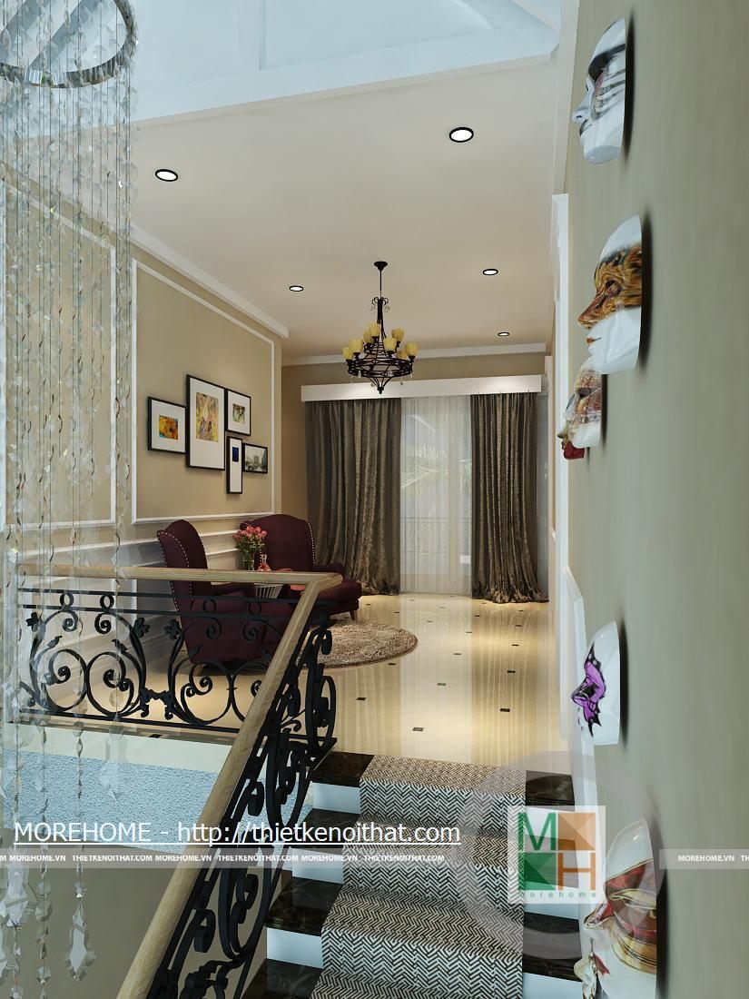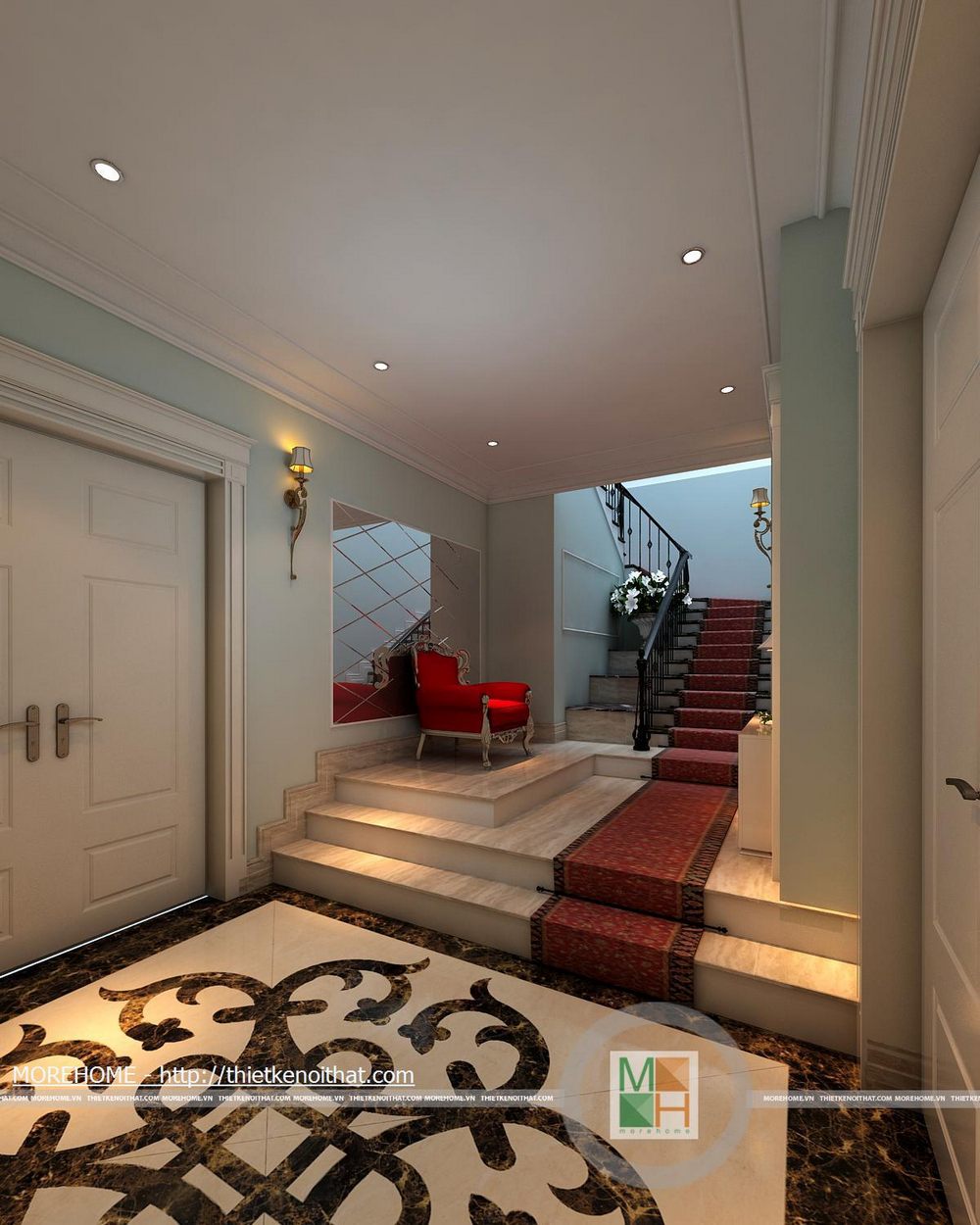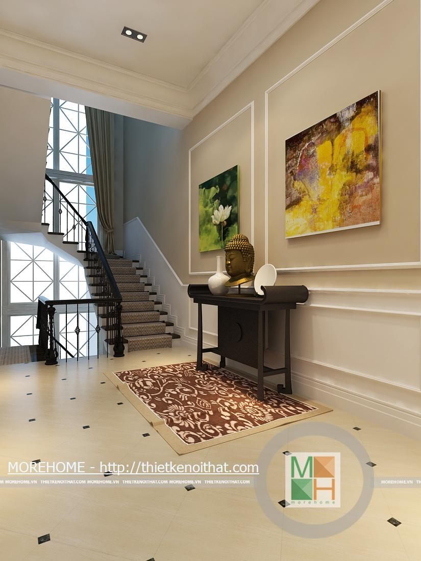 Phía bên trái chân cầu thang đặt một ghế tựa vừa để trang trí thêm cho ngôi nhà vừa để gia chủ có thể ngồi nghỉ. Ở vị trí bên phải bố trí một kệ để gương cùng một số vật dụng trang trí độc đáo. Từ cầu thang đi lên được trải một tấm thảm màu đỏ sang trọng cùng những hoa văn độc đáo.
