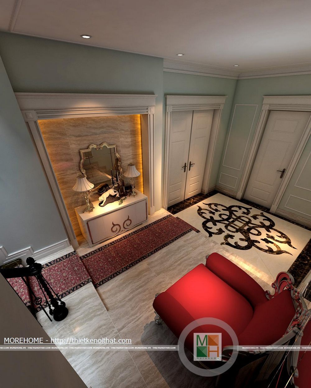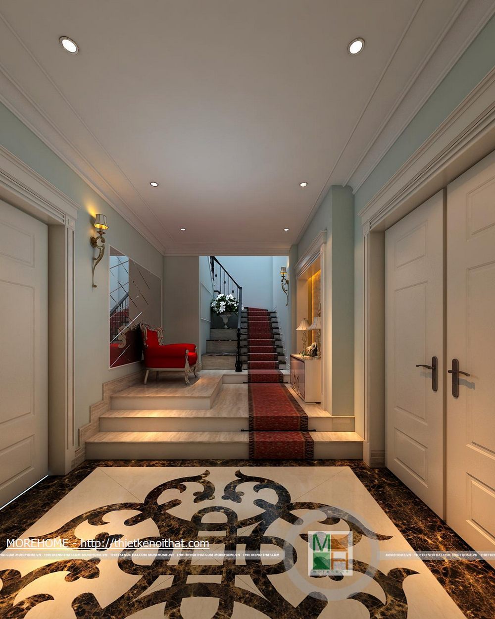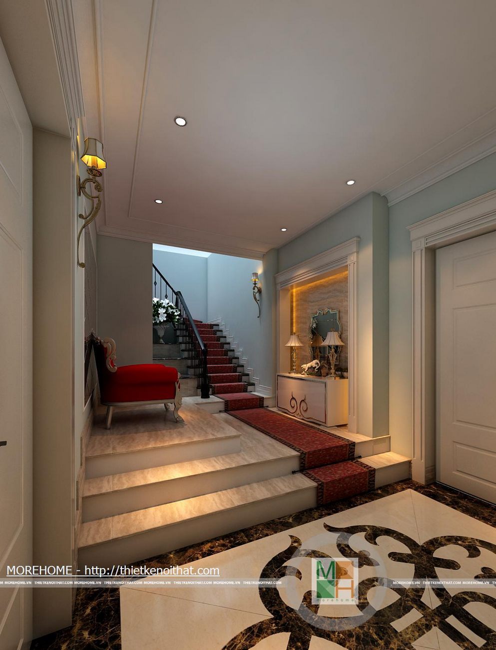 Phía bên trái chân cầu thang đặt một ghế tựa vừa để trang trí thêm cho ngôi nhà vừa để gia chủ có thể ngồi nghỉ. Ở vị trí bên phải bố trí một kệ để gương cùng một số vật dụng trang trí độc đáo. Từ cầu thang đi lên được trải một tấm thảm màu đỏ sang trọng cùng những hoa văn độc đáo.