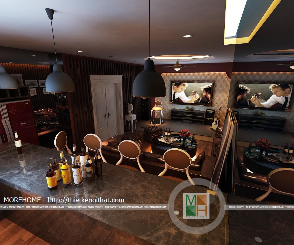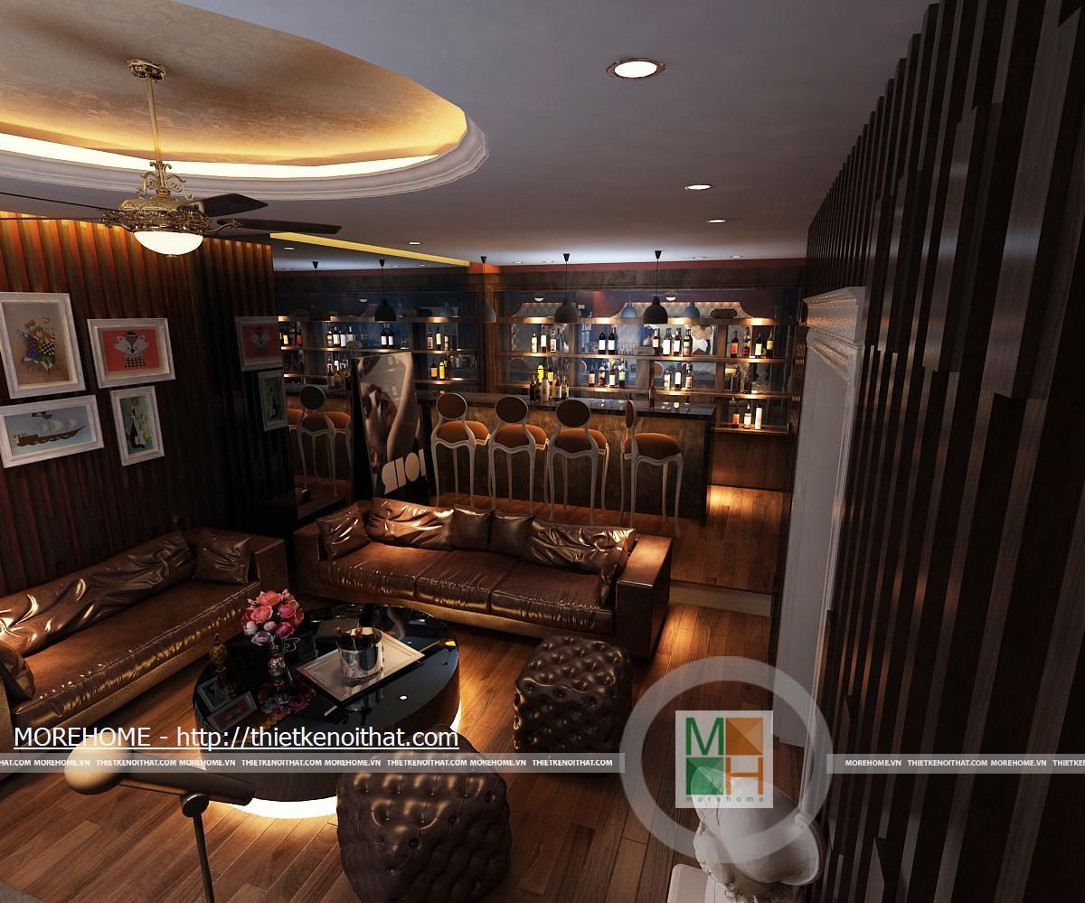 Phòng giải trí của căn nhà vô cùng hiện đại với tông màu nâu sẫm chủ đạo phù hợp làm nơi giải trí mỗi dịp nhà chủ có bạn bè đến chơi. Nội thất trong phòng được thiết kế đơn giản gồm bộ sô pha lớn, rộng rãi. Phòng được bố trí các thiết bị giải trí cao cấp như màn hình lớn. bên cạnh đó còn có một quầy bả nhỏ cùng một tủ rượu tạo sự sang trọng cho căn phòng. Hệ thống ánh sáng của phòng bao gồm đèn mắt trần cũng đèn chùm kiểu dáng tinh tế.