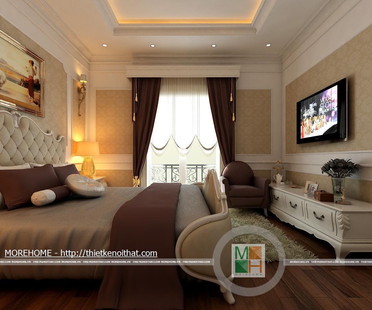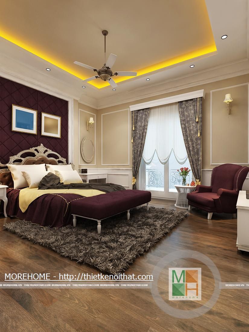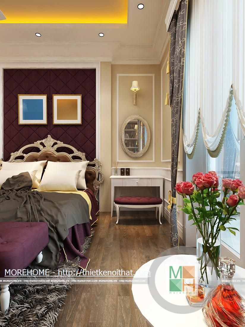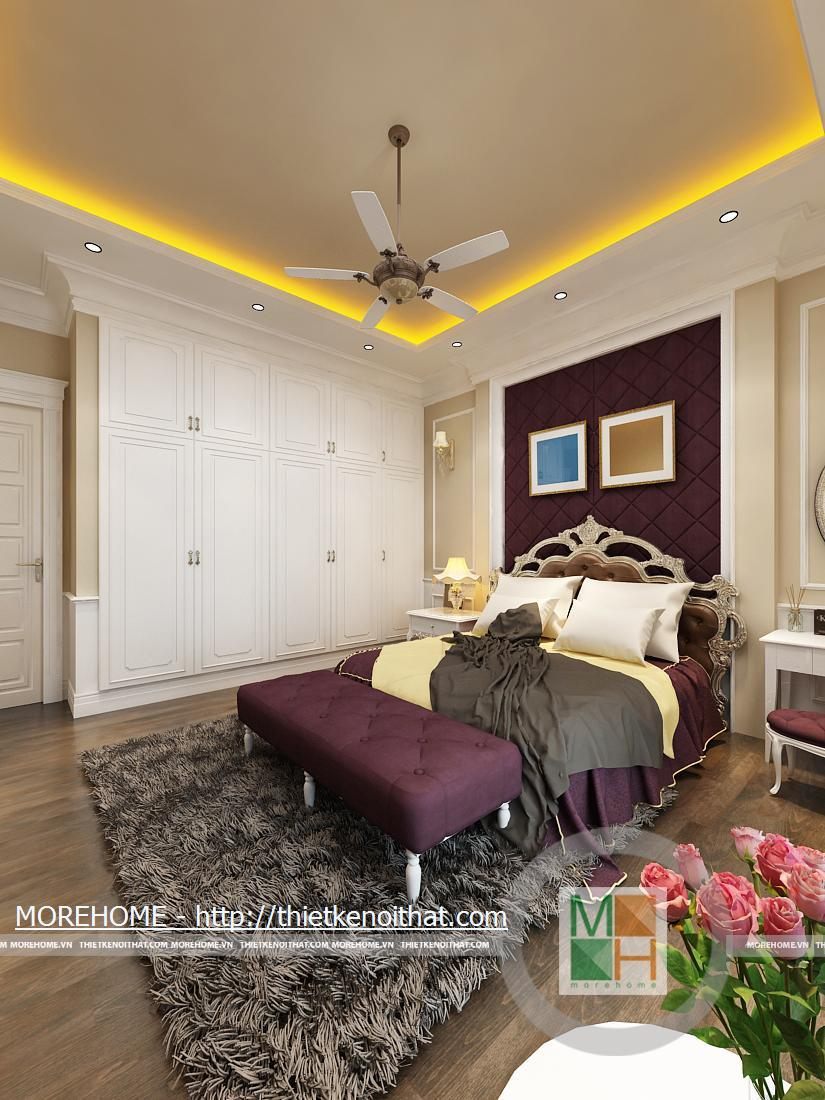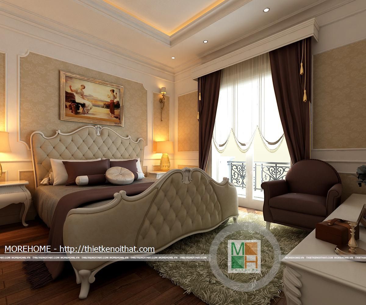 Phòng ngủ bố mẹ được thiết kế nội thất theo phong cách hiện đại có pha chút Tây Âu. Từng đường nét hoa văn trang trí trong nội thất toát đều toát lên vẻ sang trọng cho căn phòng. Điểm nhấn cho căn phòng là sự cách điệu về màu sắc, đan xen của hai tông màu chính. Cản phòng được chiếu sáng bởi hệ thống đèn âm trần và đèn mắt trâu tạo màu sắc cho phòng ngủ. Cửa lớn hướng ra ngoài ban công đem lại ánh sáng tự nhiên giúp cho không gian phòng thêm thông thoáng hơn. Bên cạnh đó căn phòng còn được thiết kế thêm một gian nhỏ dùng để đọc sách và làm việc. Phòng tắm được trang bị nội thất tiện nghi, toàn bộ tường được ốp đá cẩm thạch. Buồng tắm lớn đặt ở góc phòng và ở phía gần cửa ra vào có một chiếc gương vừa dùng để trang trí và phục vụ gia chủ.