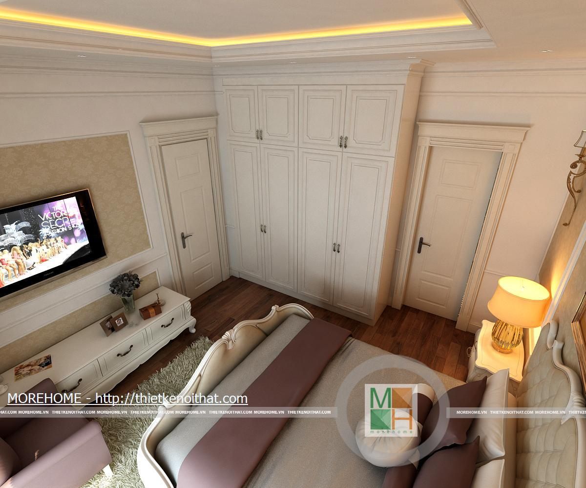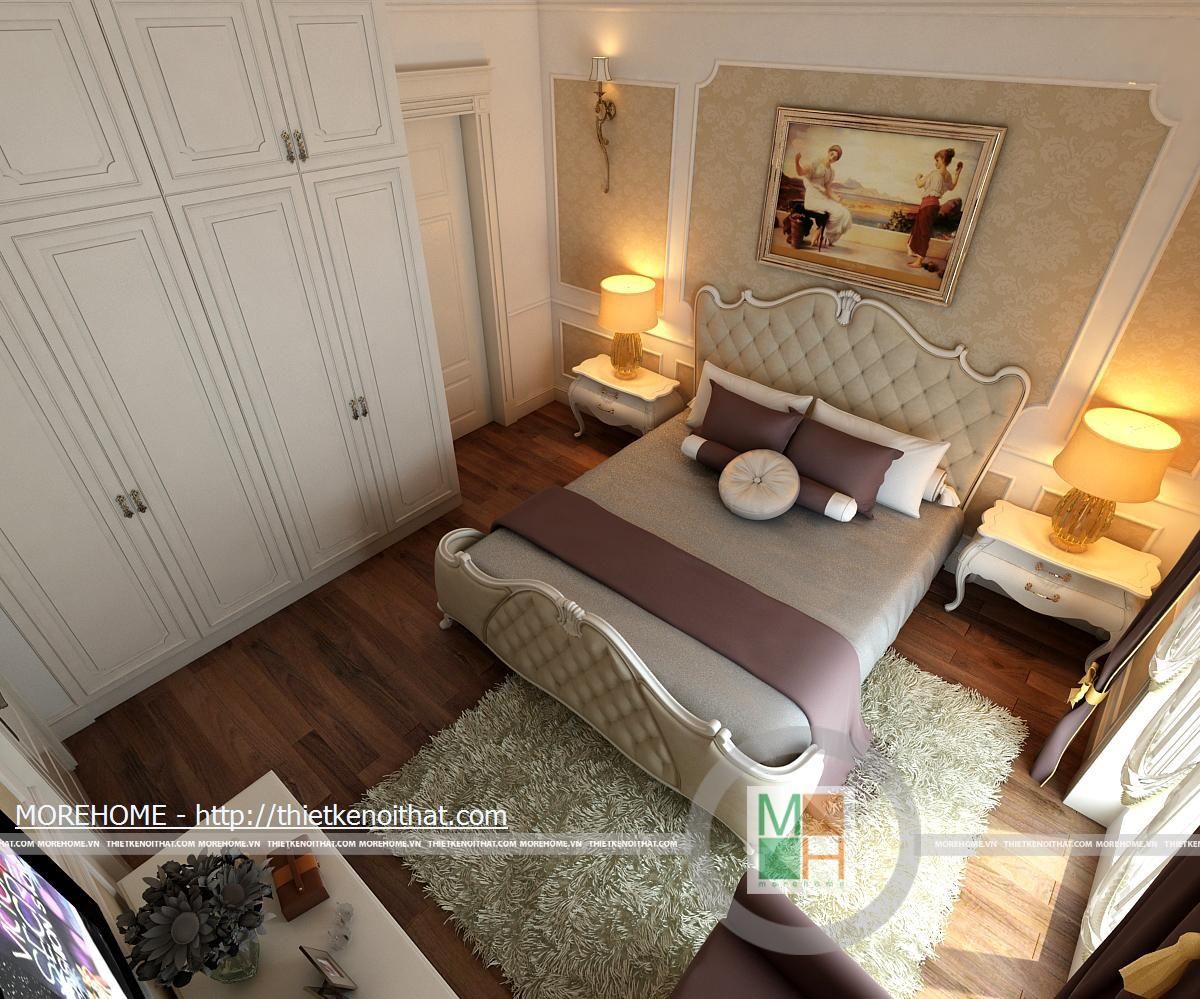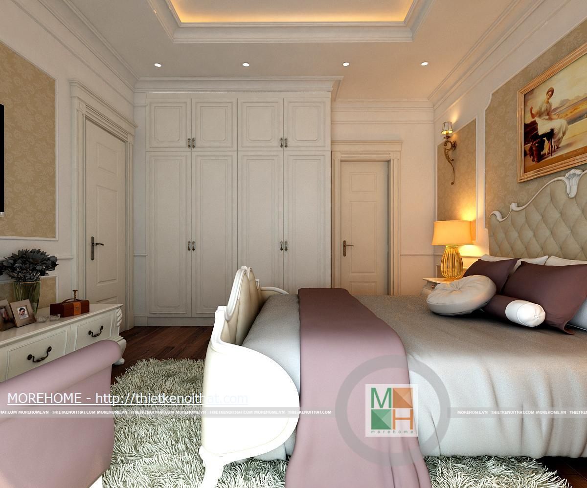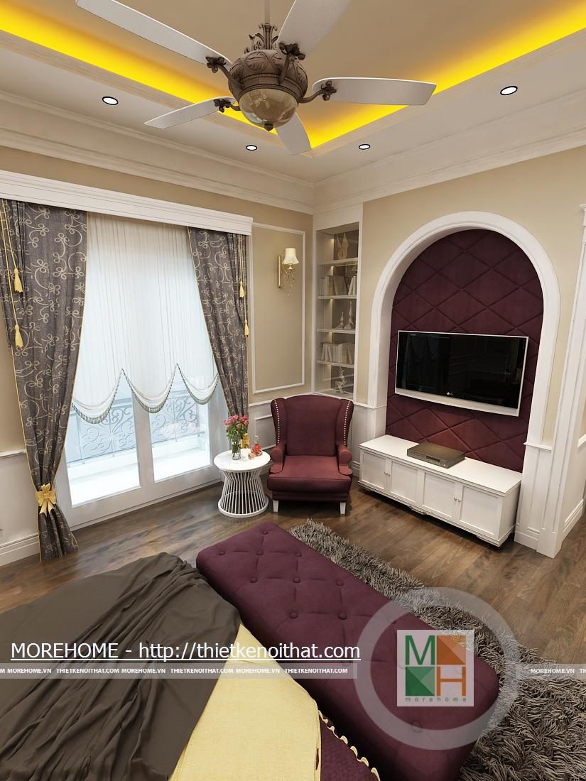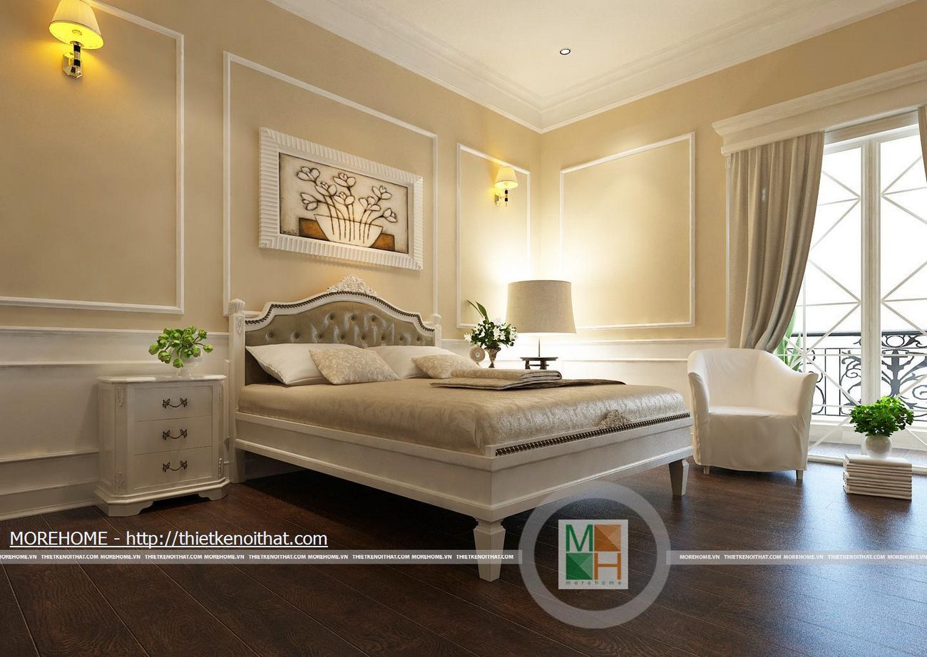 Phòng ngủ bố mẹ được thiết kế nội thất theo phong cách hiện đại có pha chút Tây Âu. Từng đường nét hoa văn trang trí trong nội thất toát đều toát lên vẻ sang trọng cho căn phòng. Điểm nhấn cho căn phòng là sự cách điệu về màu sắc, đan xen của hai tông màu chính. Cản phòng được chiếu sáng bởi hệ thống đèn âm trần và đèn mắt trâu tạo màu sắc cho phòng ngủ. Cửa lớn hướng ra ngoài ban công đem lại ánh sáng tự nhiên giúp cho không gian phòng thêm thông thoáng hơn. Bên cạnh đó căn phòng còn được thiết kế thêm một gian nhỏ dùng để đọc sách và làm việc. Phòng tắm được trang bị nội thất tiện nghi, toàn bộ tường được ốp đá cẩm thạch. Buồng tắm lớn đặt ở góc phòng và ở phía gần cửa ra vào có một chiếc gương vừa dùng để trang trí và phục vụ gia chủ.