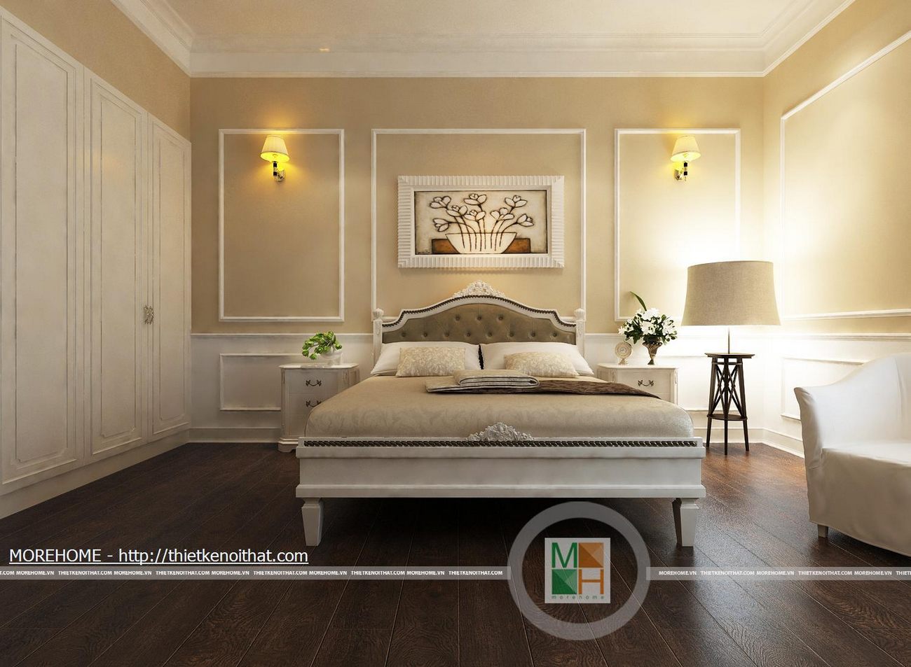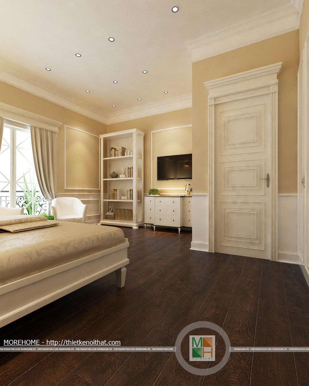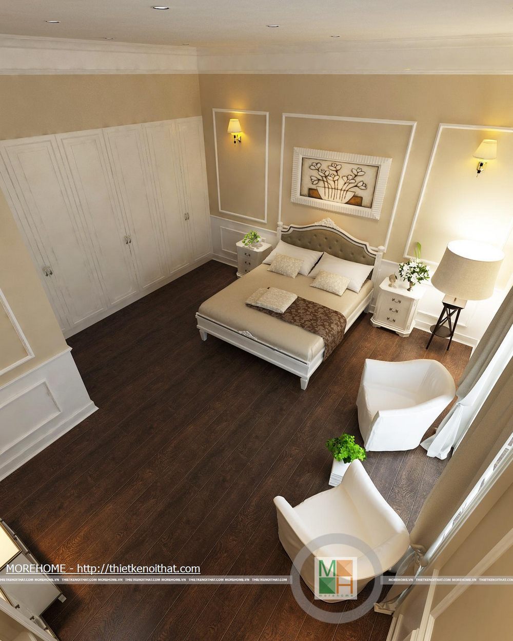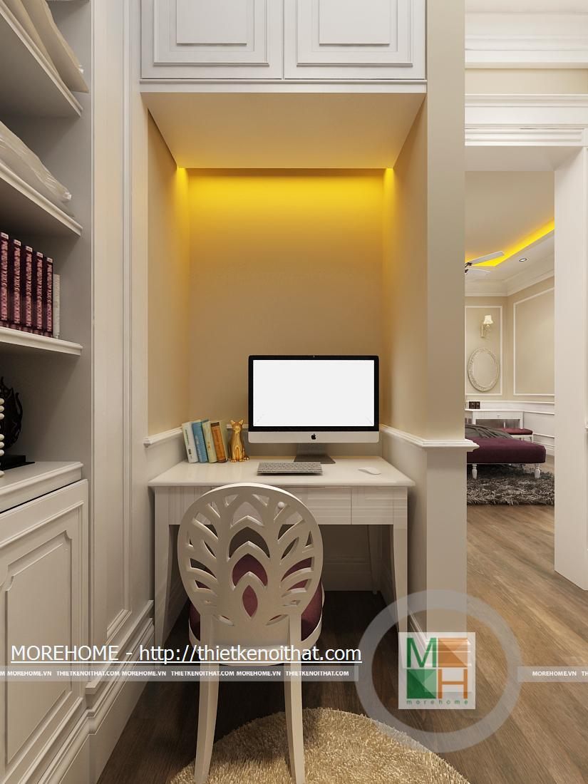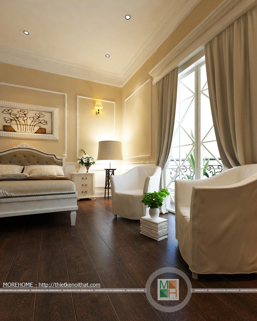 Phòng ngủ bố mẹ được thiết kế nội thất theo phong cách hiện đại có pha chút Tây Âu. Từng đường nét hoa văn trang trí trong nội thất toát đều toát lên vẻ sang trọng cho căn phòng. Điểm nhấn cho căn phòng là sự cách điệu về màu sắc, đan xen của hai tông màu chính. Cản phòng được chiếu sáng bởi hệ thống đèn âm trần và đèn mắt trâu tạo màu sắc cho phòng ngủ. Cửa lớn hướng ra ngoài ban công đem lại ánh sáng tự nhiên giúp cho không gian phòng thêm thông thoáng hơn. Bên cạnh đó căn phòng còn được thiết kế thêm một gian nhỏ dùng để đọc sách và làm việc. Phòng tắm được trang bị nội thất tiện nghi, toàn bộ tường được ốp đá cẩm thạch. Buồng tắm lớn đặt ở góc phòng và ở phía gần cửa ra vào có một chiếc gương vừa dùng để trang trí và phục vụ gia chủ.