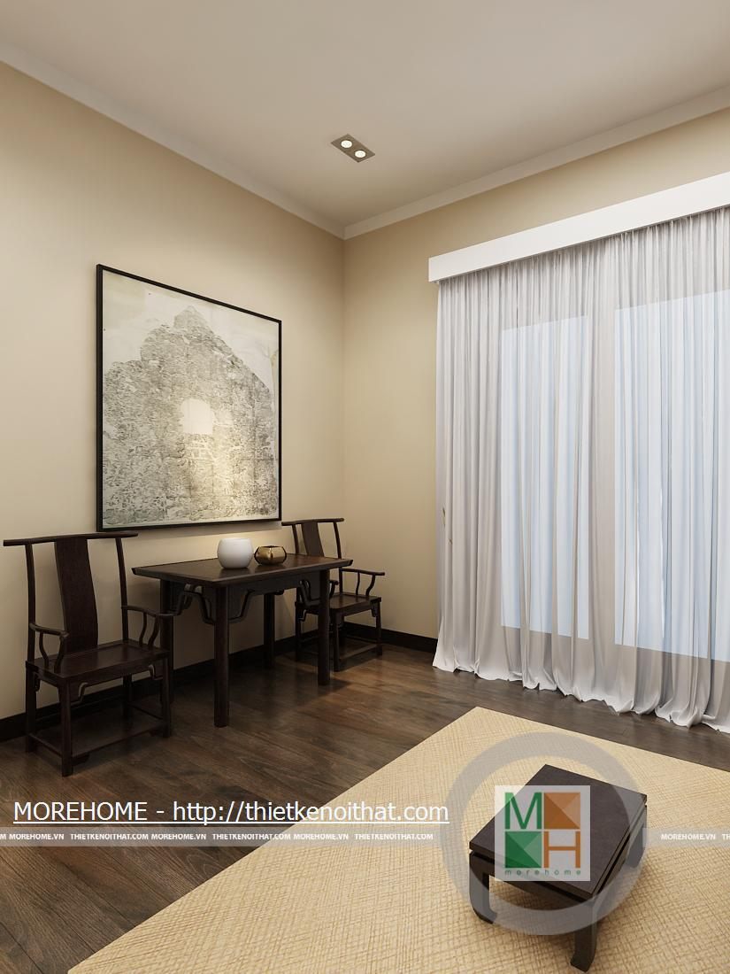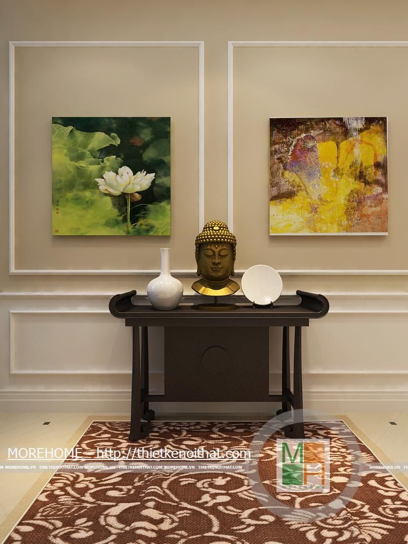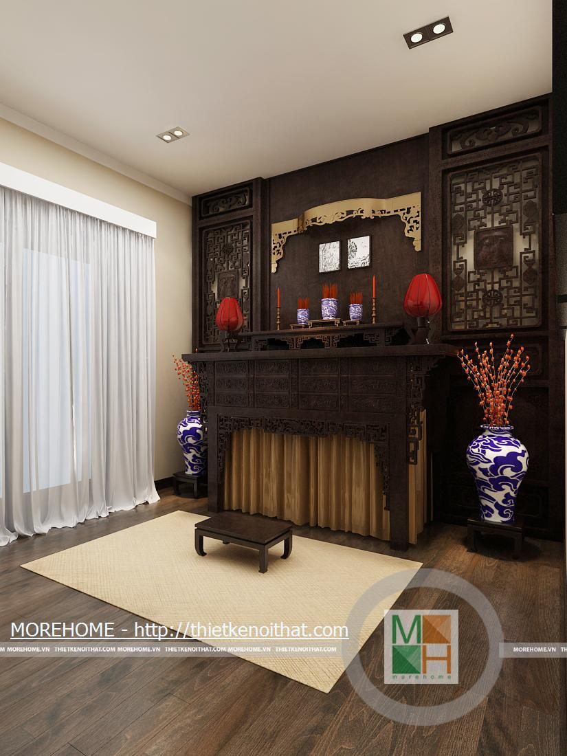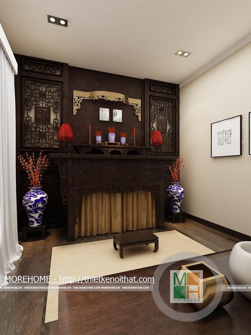 Bàn thờ tổ tiên được đặt trong một phòng riêng, thiết kế theo phong cách phương Đông. Không gian phòng thờ không quá rộng do đó dễ tạo được sự ấm cúng. Nội thất trong phòng như ban thờ, bình hoa…được thiết kế theo lối truyền thống.