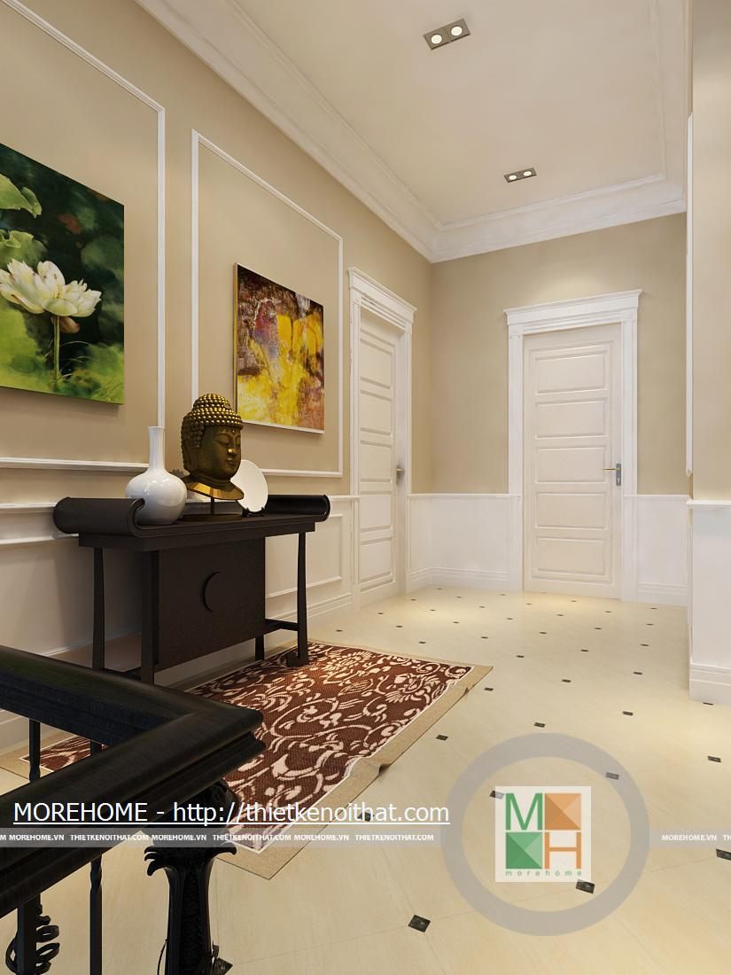 Khoảng không gian của hành lang đi cầu thang lên khá rộng và được đặt ban thờ bồ tát kết hợp với hai bức tranh tường tạo nên không gian thanh tịnh cho ngôi nhà. Khu vực sảnh cùng vị trí ở tầng trên được kê một bộ bàn ghế nhỏ có thể làm nơi tiếp khách hoặc nghỉ ngơi, thư giãn.