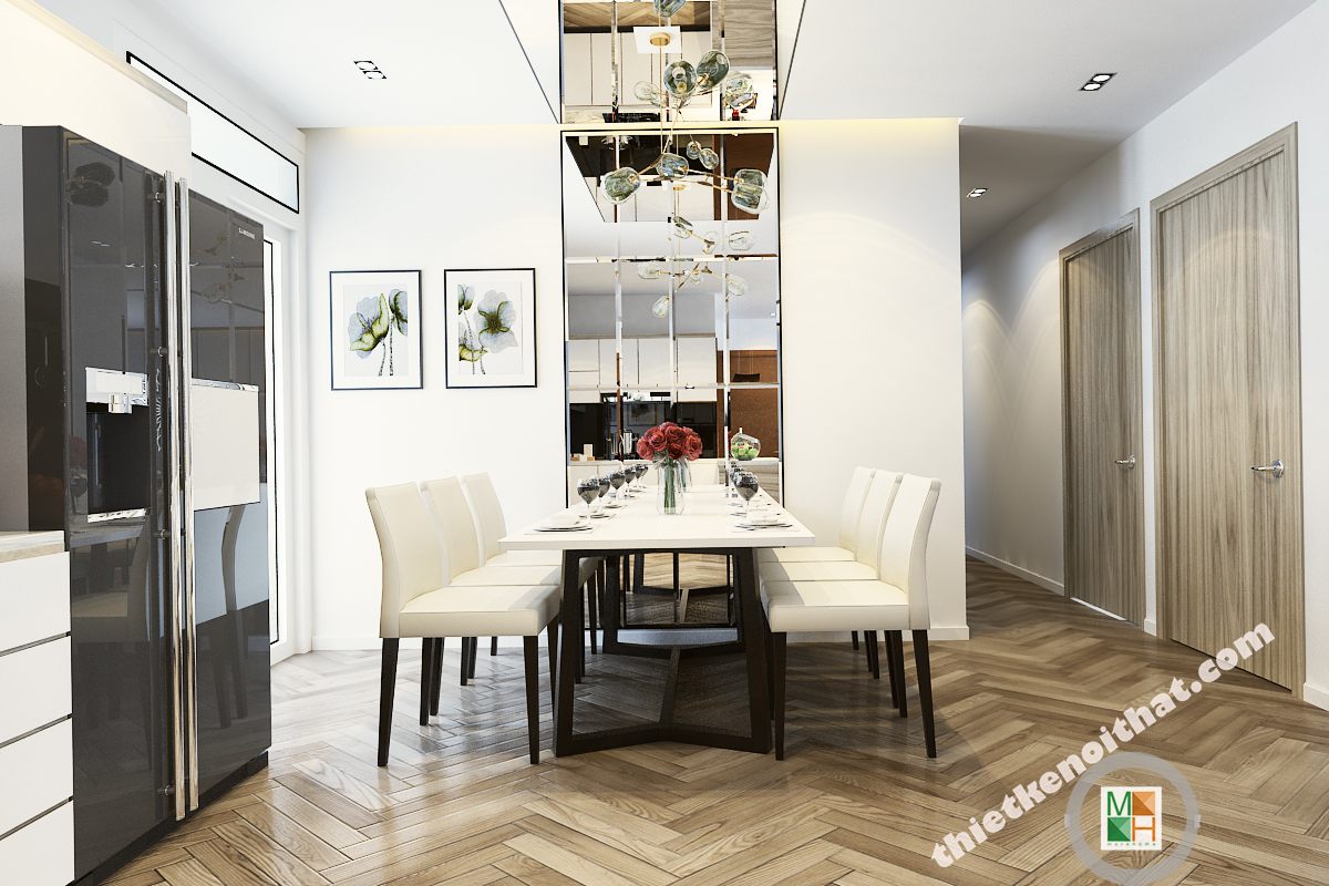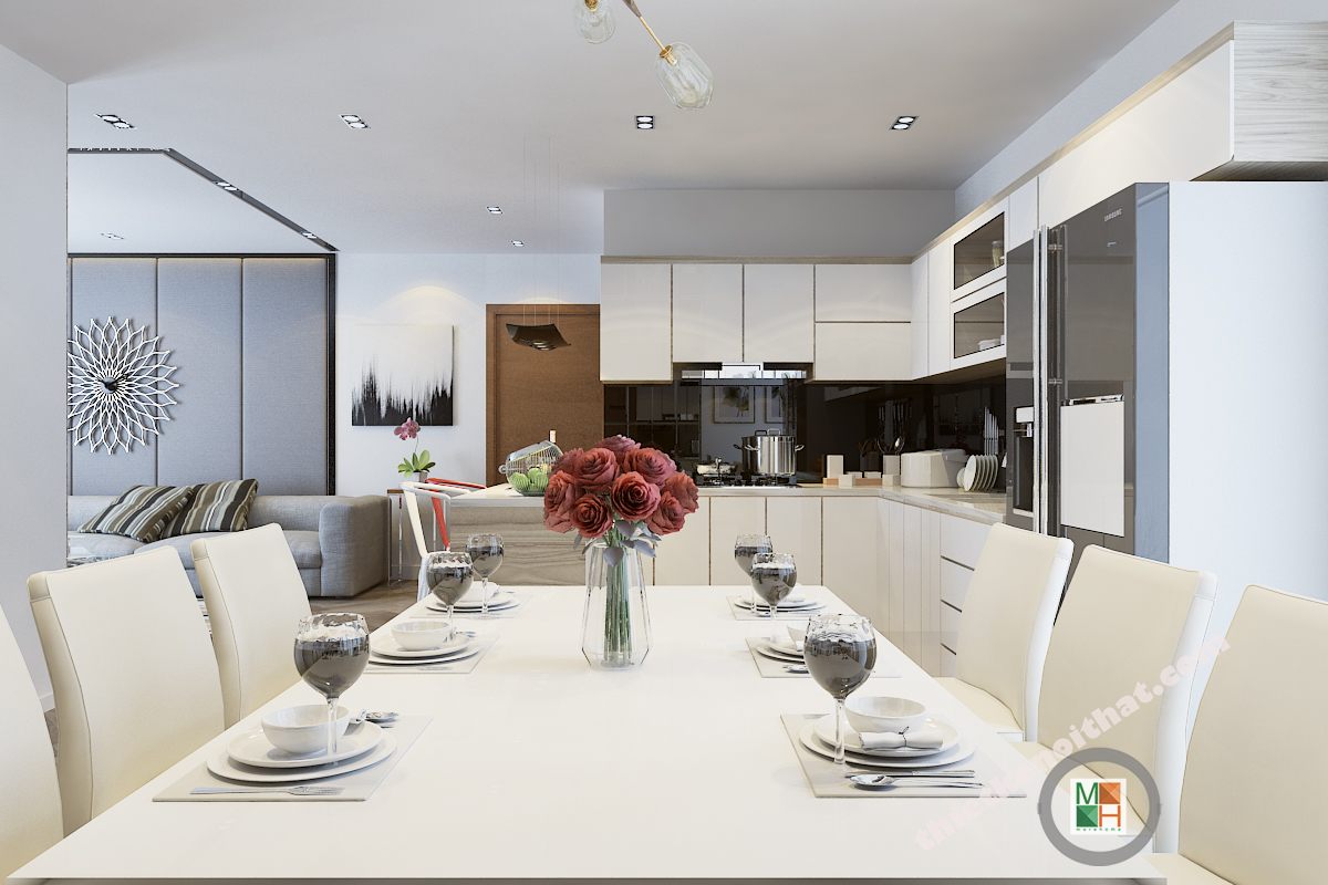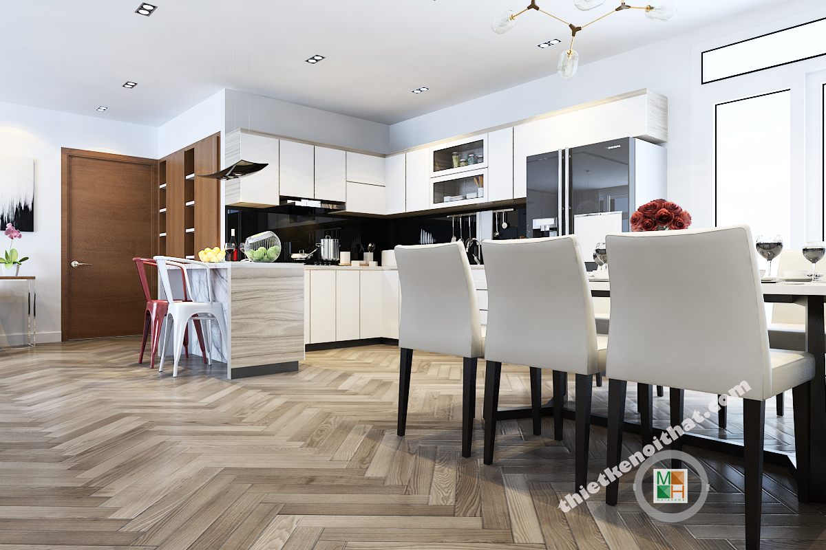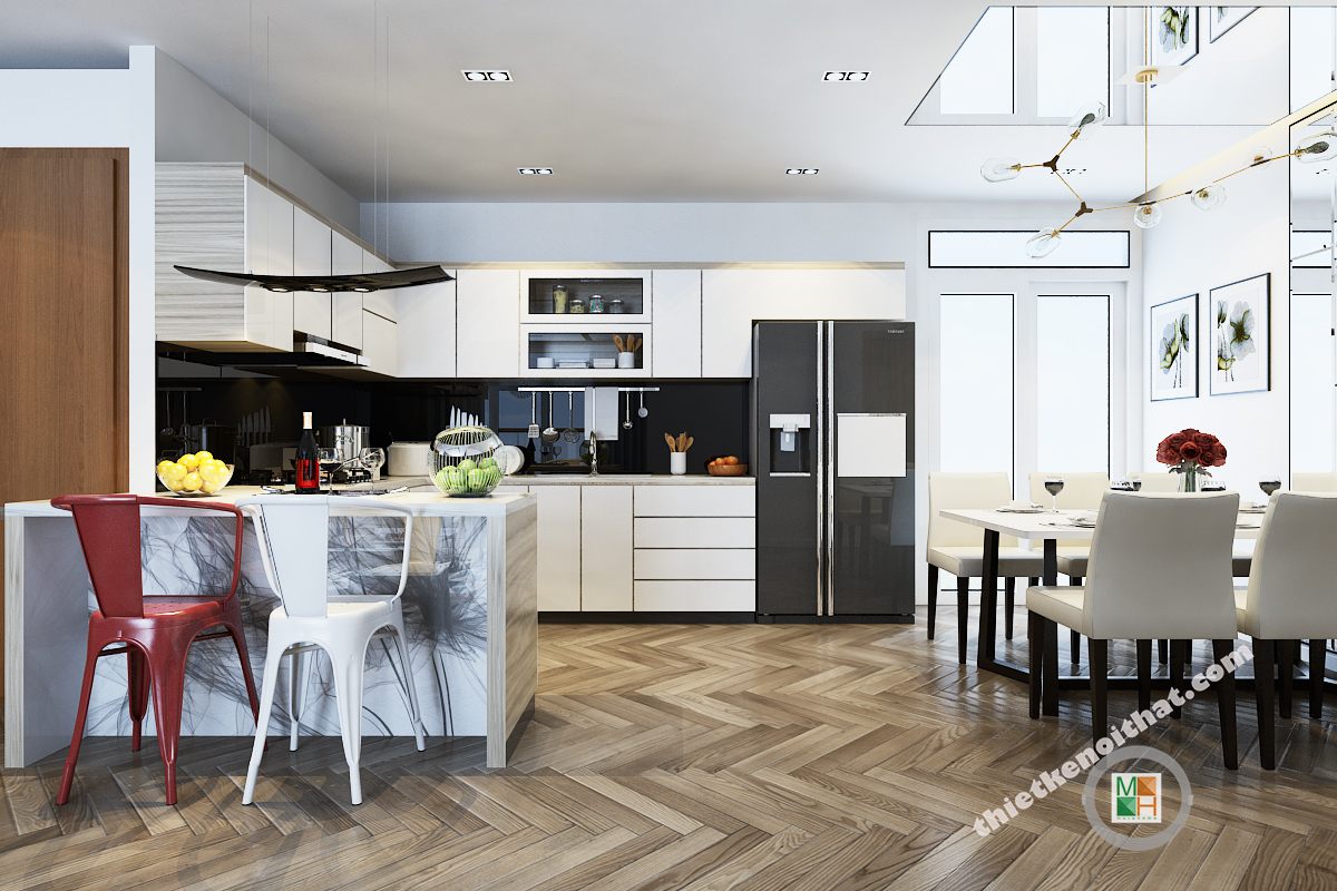 Gam màu tương phản trắng đen luôn là tone màu được chuộng hiện nay. Nó không chỉ mang đến sự sang trọng mà còn mang đến 1 không gian có tính thẩm mỹ cao. Tủ bếp với đầy đủ những tiện nghi giúp các mẹ nội trợ vào bếp nấu những bữa cơm ngon và nóng hổi. Bàn ăn hiện mang đến không khí gia đình quây quần, hạnh phúc.