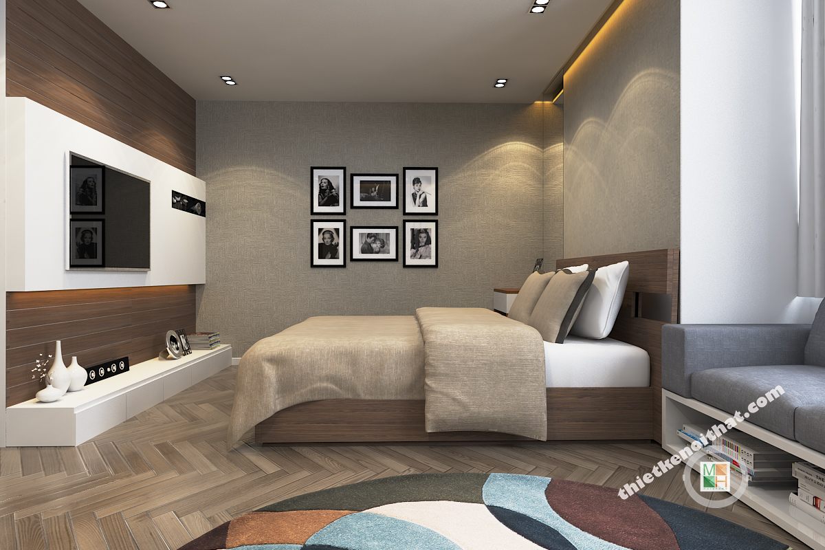 Nội thất phòng ngủ với những gam màu trầm ấm mang đến cảm giác ấm áp, ấm cúng mỗi khi bước vào không căn phòng. Những bức tranh đen trắng sẽ giúp không gian thêm sang trọng, lịch sự và tạo cảm giác thoáng mát, rộng rãi. Đây hiện là mẫu thiêt kế nội thất phòng ngủ đang được chuộng nhất trên thị trường hiện nay.