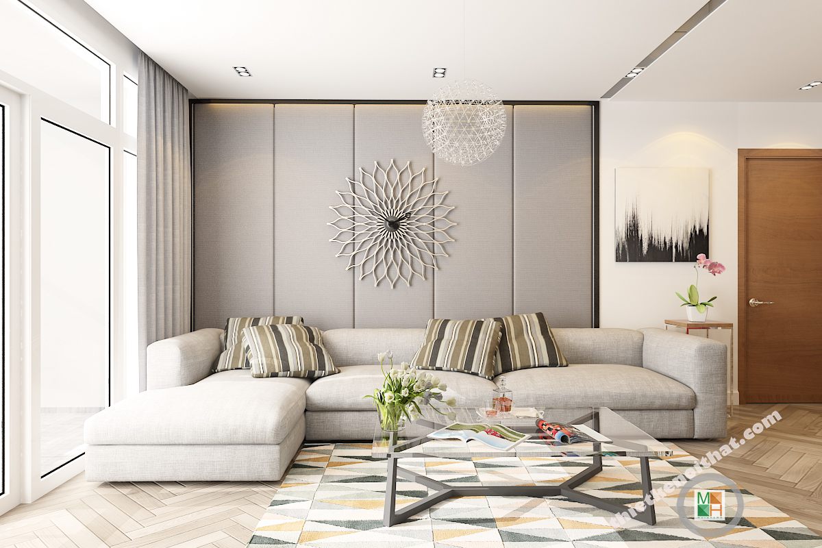 Bộ bàn ghế sofa được thiết kế theo phong cách hiện đại kết hợp cùng với chiếc bàn trà kính giúp tạo nên không gian phòng khách trở nên lịch sự và ấn tượng hơn trong mắt người nhìn. Những món đồ decor góp phần giúp tô điểm thêm giá trị thẩm mỹ cho không gian căn phòng.
