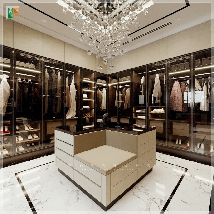 Morehome chia sẻ không gian phòng thay đồ sang trọng tân cổ điển tại biệt thự cao cấp.