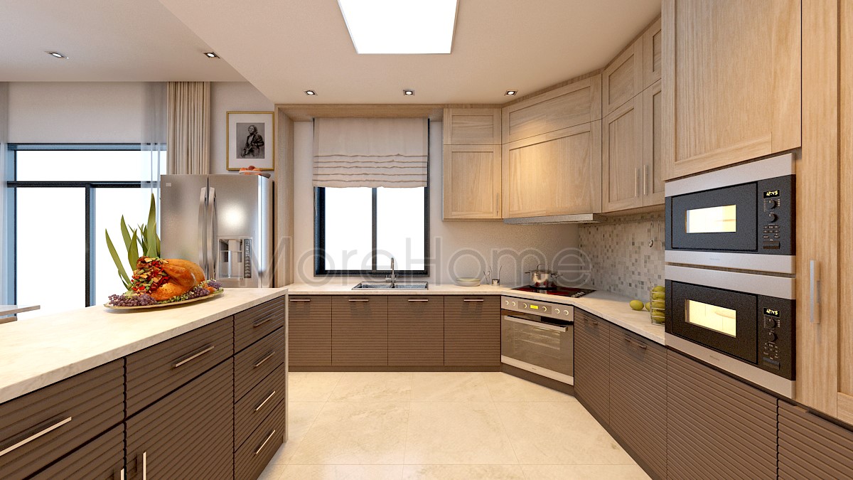 Hệ thống tủ bếp hiện đại giúp khu vực nhà bếp được mở rộng hơn về mặt diện tích, các kiến trúc sư đã thiết kế tủ bếp thiết kế hiện đại, cùng với giá để đồ treo tường để đảm bảo khu vực nấu ăn luôn gọn gàng, sạch đẹp.