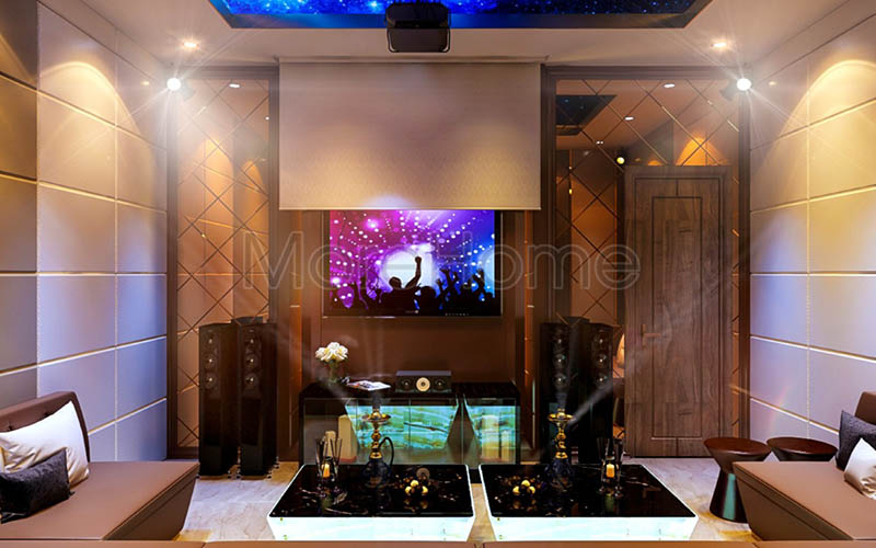 Với kích thước căn phòng như trên, bạn sẽ có được không gian giải trí với âm thanh chuẩn nhất. Ngoài ra, bạn cũng nên chú ý đến chất liệu thi công phòng giải trí biệt thự. Những vật có độ cứng càng thấp, càng gồ ghề thì có độ hấp thụ âm càng cao. Vì vậy, một tấm thảm được trải dưới sàn, hệ thống cách âm được bố trí trong phòng và những chất liệu như xốp, thạch cao hay nỉ dùng để tiêu âm thanh dội trong phòng.