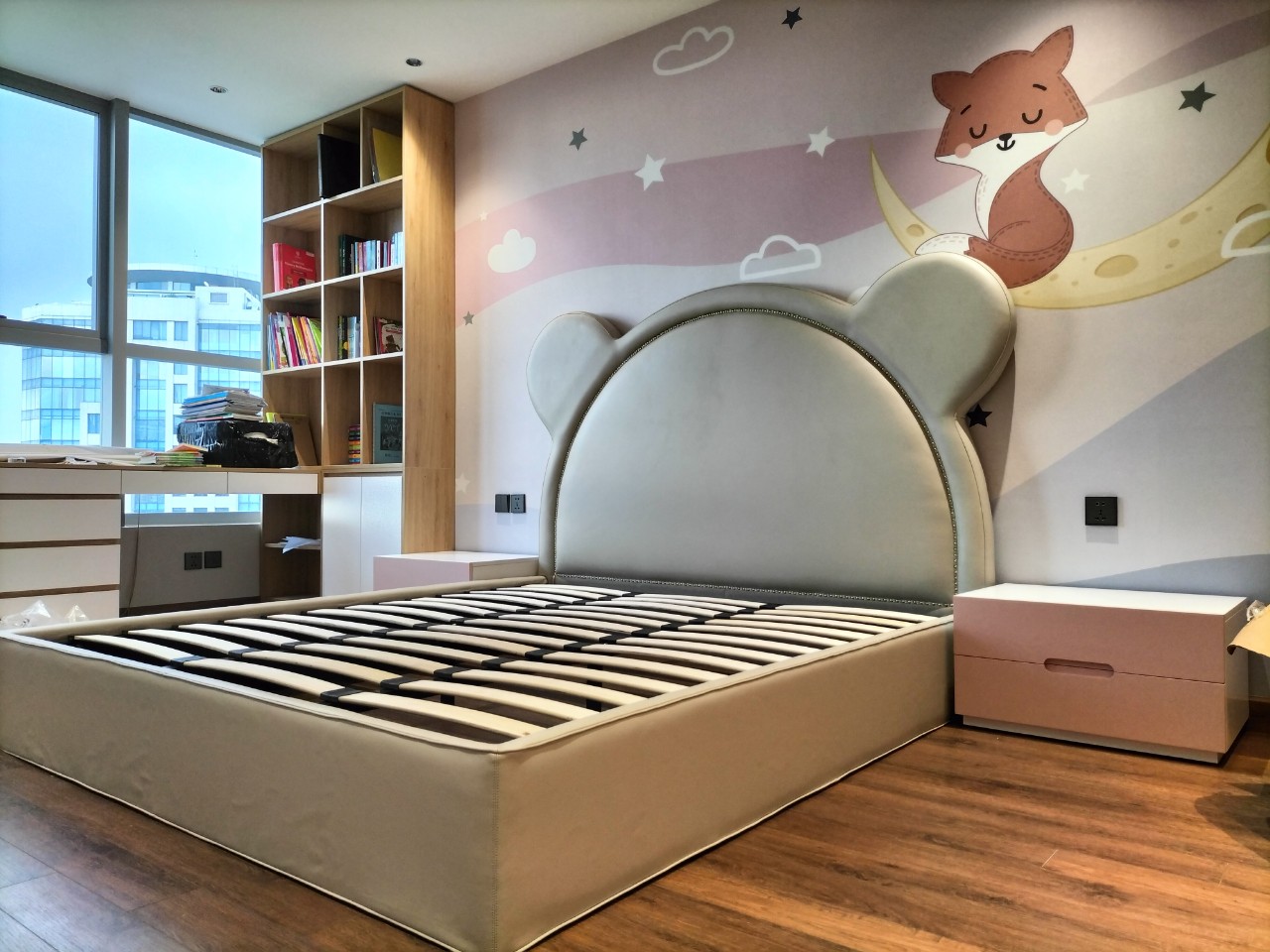 với những hình ảnh thú vuiPhòng ngủ trẻ em dành cho bé gái có một giường ngủ bọc da hình dáng con chuột, tab gỗ công nghiệp màu hồng và tranh dán tường với những hình ảnh thú vui.