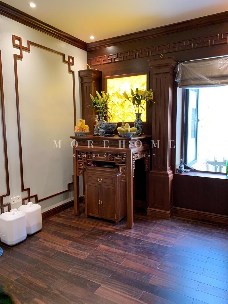 Thi công tủ thờ gỗ tự nhiên phù hợp với không gian của gia đình, đảm bảo chuẩn phong thủy và mang đậm yếu tố tâm linh, giữ được những đường nét truyền thống