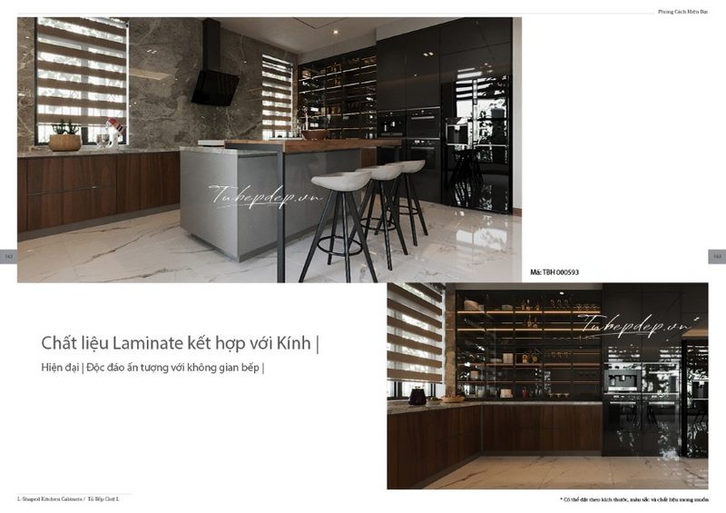 . Mẫu tủ bếp mới và độc đáo, trẻ trung được thiết kế để phù hợp với các căn biệt thự, nhà phố hiện đại cung cấp sự tiện nghi và sự sang trọng. Đá ốp bếp được sử dụng rộng rãi trên một phần tường lớn giúp tạo nên một vẻ đẹp bền vững qua thời gian.