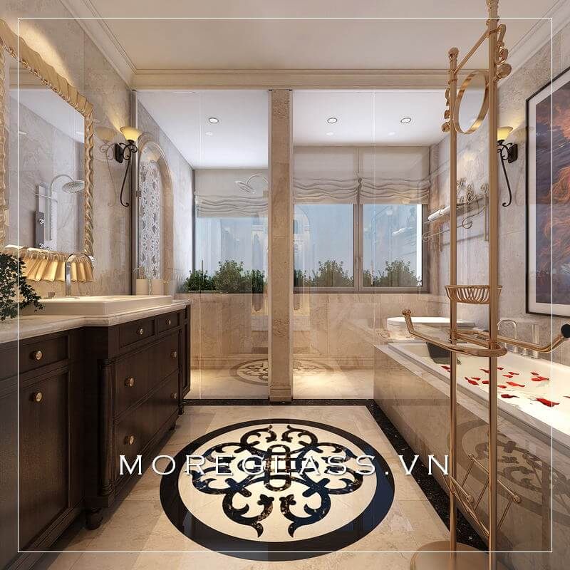 Phòng tắm biệt thự nổi bật với mẫu đá ốp sàn hoa văn độc đáo mang vẻ đẹp sang trọng, cuốn hút mọi ánh nhìn
