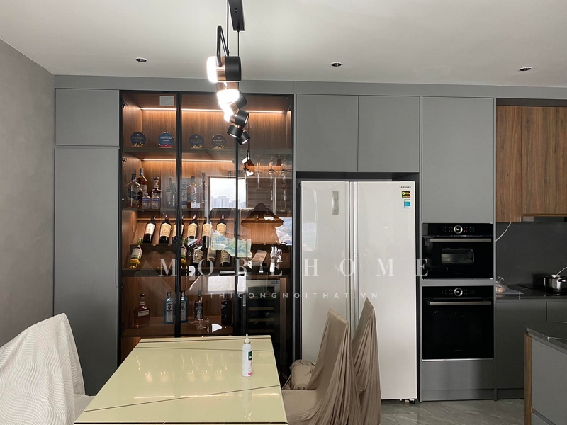Việc thi công tủ rượu cánh kính để trưng bày và sắp xếp các chai rượu cũng như làm nên một phong cảnh trang trí ấn tượng cho căn phòng.