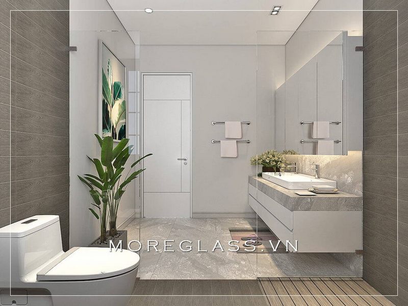 Mẫu thiết kế nhà tắm và nhà vệ sinh hiện đại được trang trí bằng vật liệu đá và kính cường lực, tạo nên một vẻ đẹp tinh tế và sang trọng.