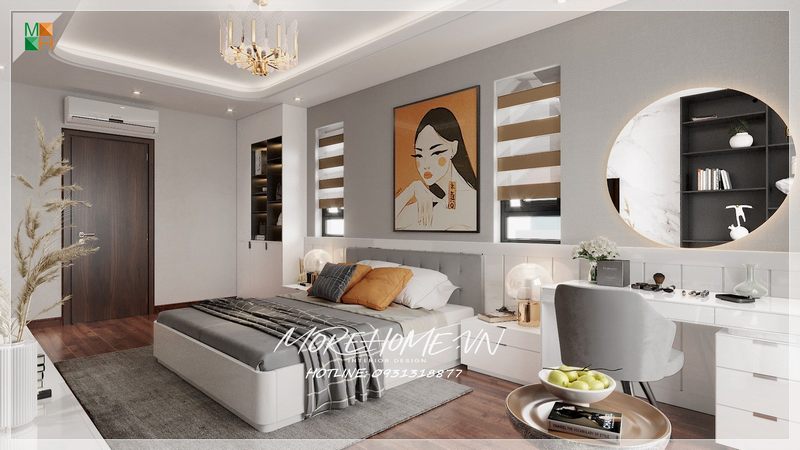 Bàn trang điểm hiện đại được bố trí gần giường ngủ lớn để cung cấp sự tiện lợi cho người sử dụng, giúp chăm sóc làm đẹp cho chủ nhân của căn phòng.